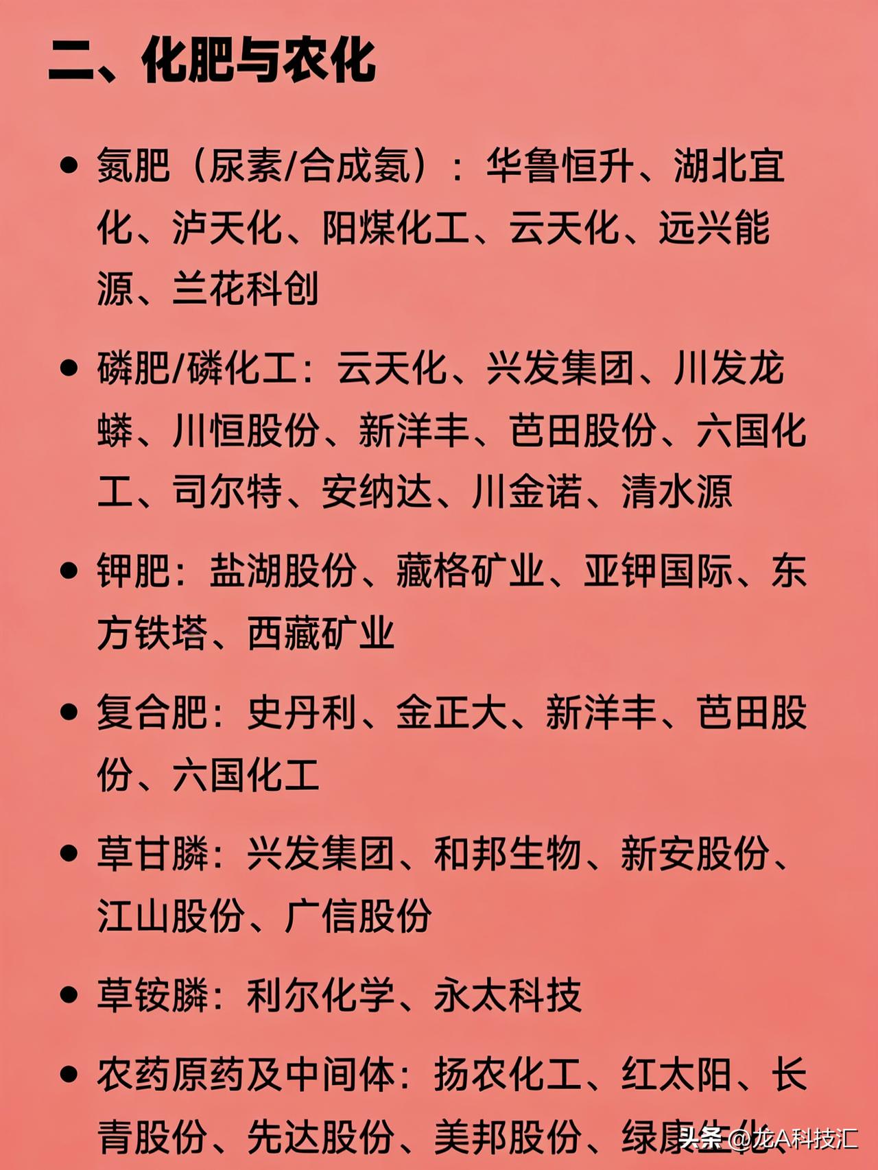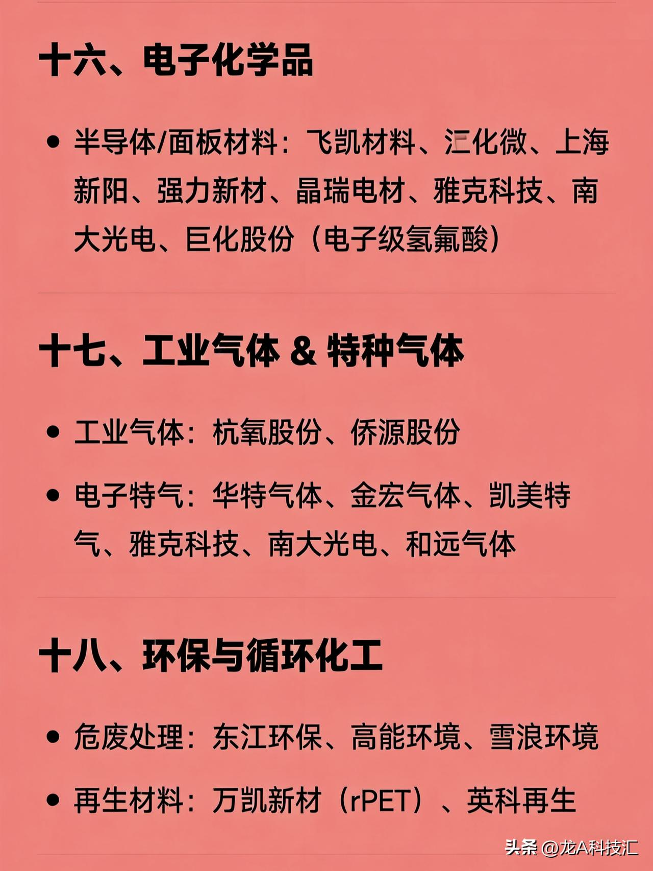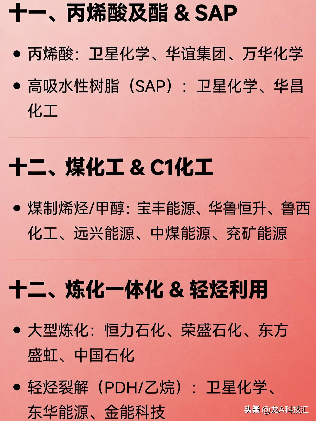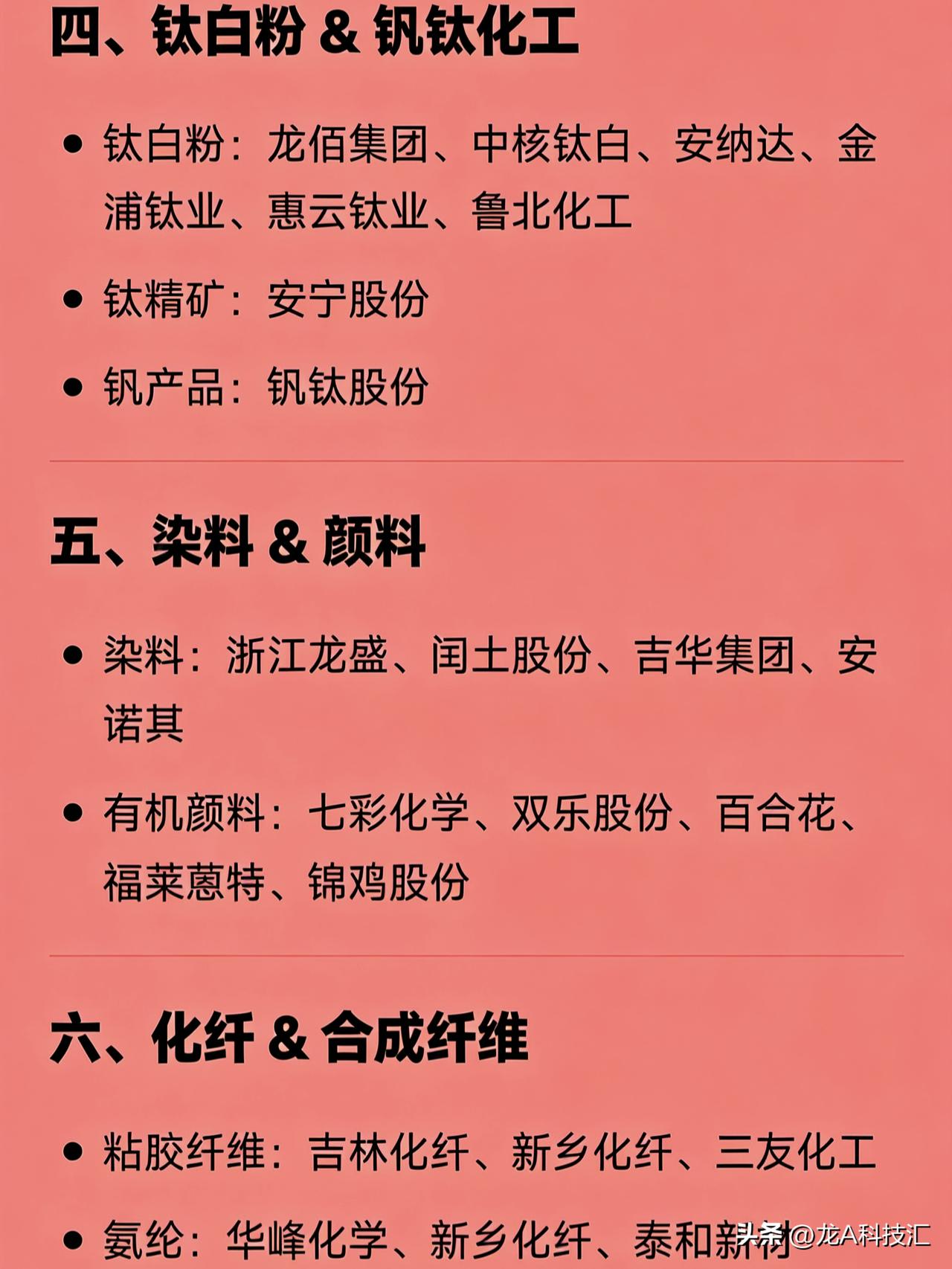最新、最全面的化工概念企业全梳理 一、基础无机化工 氯碱(烧碱/PVC):新疆天业、中泰化学、氯碱化工、英力特、三友化工、金牛化工 纯碱:山东海化、远兴能源、双环科技、和邦生物、苏盐井神、雪天盐业 工业盐/盐化工:苏盐井神、雪天盐业、吉兰泰(中盐化工) 硫酸/硫化工:鲁北化工、云图控股、川能动力、龙佰集团 二、化肥与农化 氮肥(尿素/合成氨):华鲁恒升、湖北宜化、泸天化、阳煤化工、云天化、远兴能源、兰花科创 磷肥/磷化工:云天化、兴发集团、川发龙蟒、川恒股份、新洋丰、芭田股份、六国化工、司尔特、安纳达、川金诺、清水源 钾肥:盐湖股份、藏格矿业、亚钾国际、东方铁塔、西藏矿业 复合肥:史丹利、金正大、新洋丰、芭田股份、六国化工 草甘膦:兴发集团、和邦生物、新安股份、江山股份、广信股份 草铵膦:利尔化学、永太科技 农药原药及中间体:扬农化工、红太阳、长青股份、先达股份、美邦股份、绿康生化、蓝丰生化、世龙实业、善水科技 三、氟化工 & 制冷剂 制冷剂(HFCs/HFOs):巨化股份、三美股份、永和股份、联创股份、德美化工 含氟聚合物(PVDF/PTFE):巨化股份、联创股份、东岳集团(港股)、三爱富、昊华科技 锂电氟材料(六氟磷酸锂等):多氟多、天赐材料、石大胜华、永太科技、中欣氟材 电子级氟化物/特气:雅克科技、南大光电、江化微、华特气体 四、钛白粉 & 钒钛化工 钛白粉:龙佰集团、中核钛白、安纳达、金浦钛业、惠云钛业、鲁北化工 钛精矿:安宁股份 钒产品:钒钛股份 五、染料 & 颜料 染料:浙江龙盛、闰土股份、吉华集团、安诺其 有机颜料:七彩化学、双乐股份、百合花、福莱蒽特、锦鸡股份 六、化纤 & 合成纤维 粘胶纤维:吉林化纤、新乡化纤、三友化工 氨纶:华峰化学、新乡化纤、泰和新材 锦纶(尼龙):华峰化学、神马股份、台华新材 涤纶(聚酯):恒力石化、荣盛石化、东方盛虹、桐昆股份、新凤鸣、恒逸石化 七、工程塑料 & 高性能聚合物 PC(聚碳酸酯):万华化学、利华益维远 PA66(尼龙66):神马股份、华峰化学 PMMA:万华化学、双象股份 POM:开滦股份、云天化 特种工程塑料(PI/PPS):瑞华泰、新和成 八、聚氨酯(PU) MDI/TDI:万华化学 聚醚多元醇:红宝丽、一诺威 BDO/TPU:华峰化学、美瑞新材、新疆美克 九、环氧树脂 & 酚酮产业链 环氧树脂:宏昌电子、东材科技、圣泉集团、扬农化工 十、丙烯酸及酯 & SAP 丙烯酸:卫星化学、华谊集团、万华化学 高吸水性树脂(SAP):卫星化学、华昌化工 十一、煤化工 & C1化工 煤制烯烃/甲醇:宝丰能源、华鲁恒升、鲁西化工、远兴能源、中煤能源、兖矿能源 十二、炼化一体化 & 轻烃利用 大型炼化:恒力石化、荣盛石化、东方盛虹、中国石化 轻烃裂解(PDH/乙烷):卫星化学、东华能源、金能科技 十三、硅基材料 工业硅/有机硅:合盛硅业、新安股份、东岳硅材、晨光新材、三友化工 十四、精细化工 & 专用化学品 食品添加剂:金禾实业、保龄宝、华康股份 香精香料:新和成、爱普股份 表面活性剂:赞宇科技、皇马科技、科隆股份 橡胶助剂:阳谷华泰、彤程新材、濮阳惠成 抗老化剂:利安隆 工业杀菌剂:百傲化学 医药中间体:联化科技、博瑞医药、同和药业、奥锐特、本立科技 十五、新能源材料相关化工 磷酸铁/前驱体:龙蟠科技、川发龙蟒、中核钛白、湘潭电化、红星发展、龙佰集团 六氟磷酸锂:多氟多、天赐材料、永太科技、石大胜华 PVDF(电池级):联创股份、巨化股份、东岳集团 NMP溶剂:晶瑞电材、滨州裕能 锂电粘结剂/添加剂:蓝晓科技、中欣氟材 十六、电子化学品 半导体/面板材料:飞凯材料、江化微、上海新阳、强力新材、晶瑞电材、雅克科技、南大光电、巨化股份(电子级氢氟酸) 十七、工业气体 & 特种气体 工业气体:杭氧股份、侨源股份 电子特气:华特气体、金宏气体、凯美特气、雅克科技、南大光电、和远气体 十八、环保与循环化工 危废处理:东江环保、高能环境、雪浪环境 再生材料:万凯新材(rPET)、英科再生