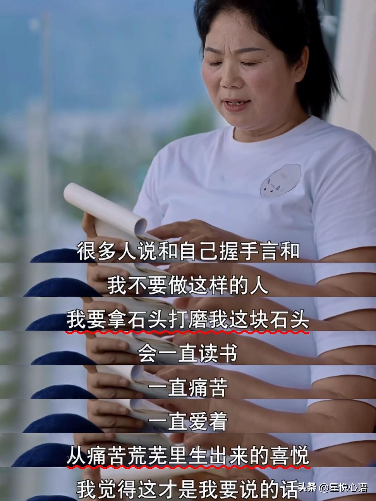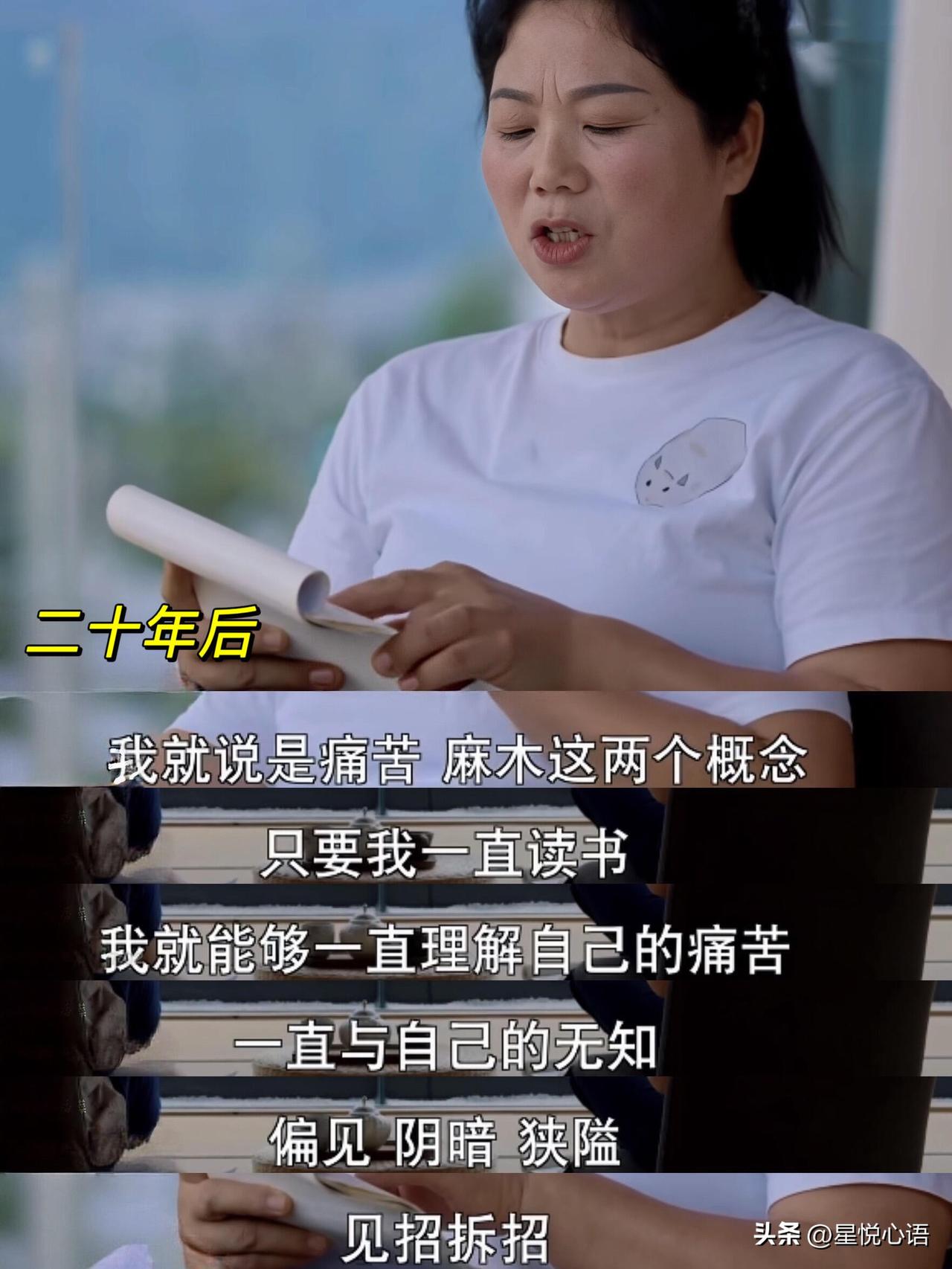 刘小样这一句“我宁可痛苦,我不要麻木”,时隔二十年依旧振聋发聩。 二十年前的她,身处陕西农村,被庸常的生活包裹,却偏要撕开一道口。 她不要只守着三餐温饱的麻木,想要知识,想要看更大的世界,哪怕这份清醒带着痛苦。 二十年后的她,活成了自己想要的样子,拥有了满满一面书柜。 她读完了那不勒斯四部曲,说要拿石头打磨石头,哪怕过程很疼也不怕。 她不跟自己握手言和,执意要“一直读书,一直痛苦,一直爱着”。 这份痛苦,不是软弱的模样,是最清醒的倔强。 磨石头的过程,是和自己的无知、狭隘对抗,是在粗粝的日子里自我雕琢。 刻出的笑脸,也从不是对生活的妥协,是认清真相后,依然愿意创造意义的热爱。 我们总被琐碎磨平棱角,慢慢变得麻木,缺的正是这份执念。 别关上心里的那扇窗,别让生活只剩庸常。 愿我们都能像刘小样,守着清醒的痛苦,在岁月里打磨自己,热烈地活,认真地爱。