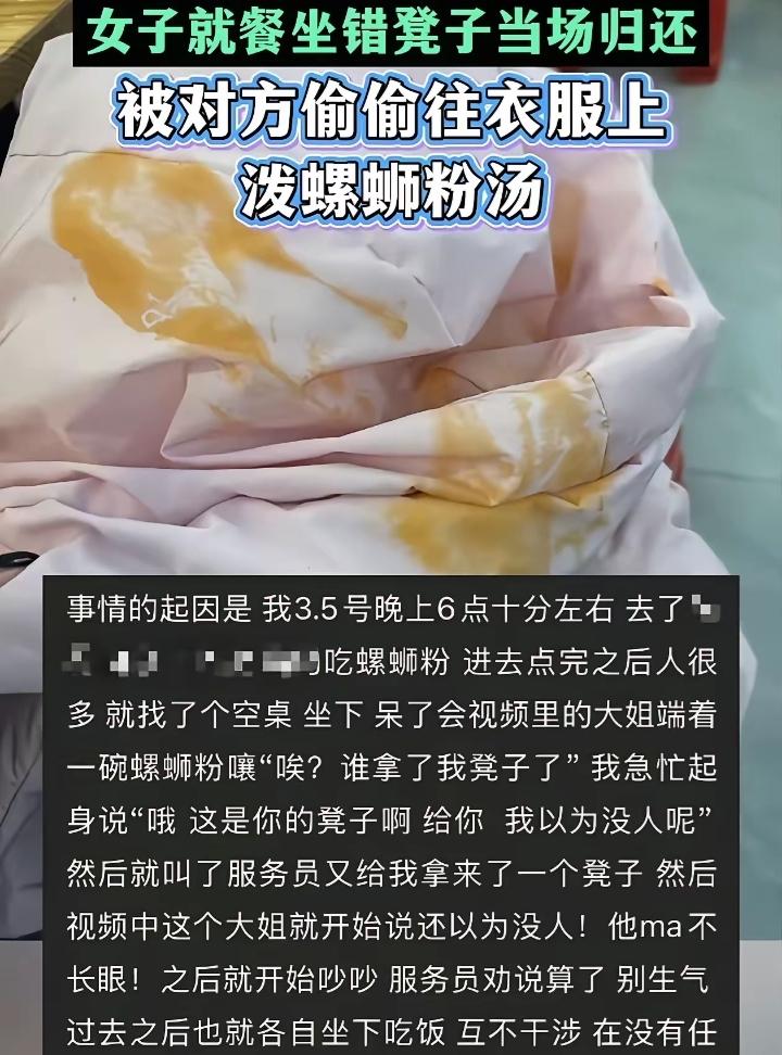 最近这段餐厅监控看得人血压飙升!明明只是小事一桩,受害女子发现坐错凳子后,第一时间归还并诚恳道歉,态度已经足够体面。可黑衣女子非但不领情,反而不依不饶开口辱骂,完全不给人台阶下。 更过分的是,双方被旁人劝开后,她居然怀恨在心,趁对方低头吃饭毫无防备时,拿起勺子将滚烫的红油汤直接倒进人帽子里。做完这一切,她还能淡定坐回原位,吃饭说笑,仿佛什么都没发生。 这根本不是一时冲动,而是骨子里的刻薄与阴暗,专门挑人毫无防备时下手,手段阴狠又小心眼。得理不饶人,道歉不接受,还要恶意报复,这种人既没素质又缺德,公共场合肆意宣泄情绪伤害他人,实在让人不齿。
