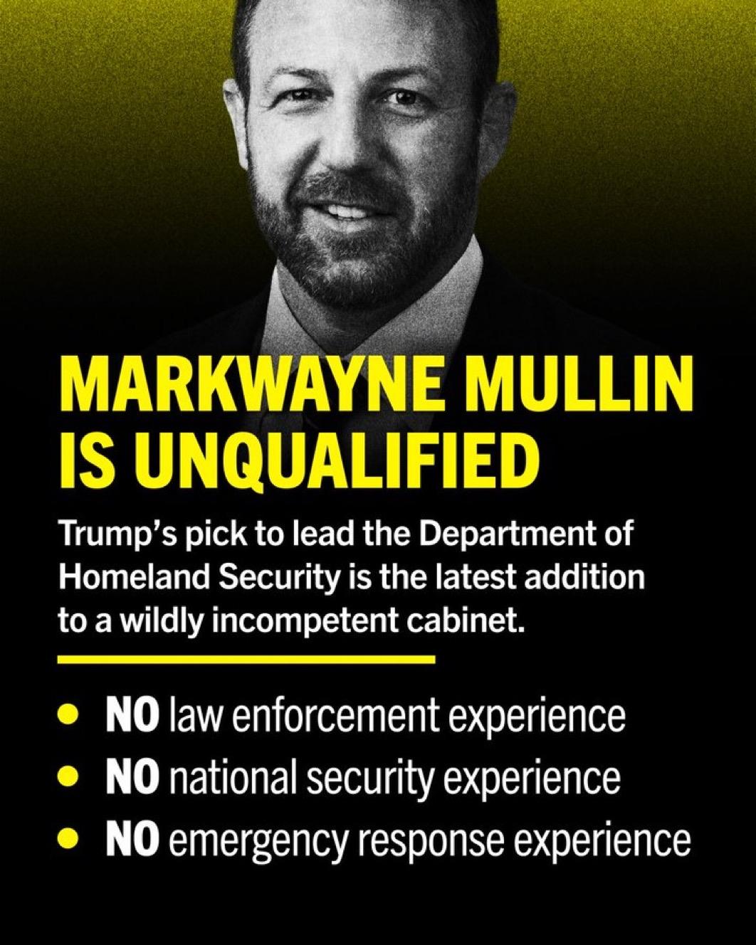 美国民主党派:马克韦恩•穆林完全不具备国土安全部部长资格 特朗普提名领导国土安全部的候选人是该部最无能内阁成员中的最新一员。 • 无执法经验 • 无国家安全经验 •无应急响应经验 典型的三无人员。[捂脸]