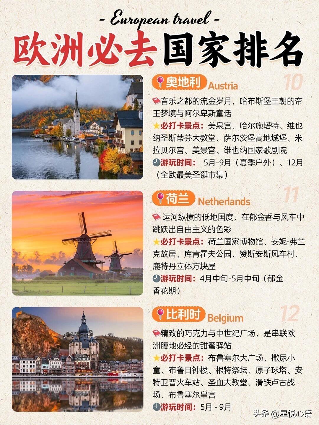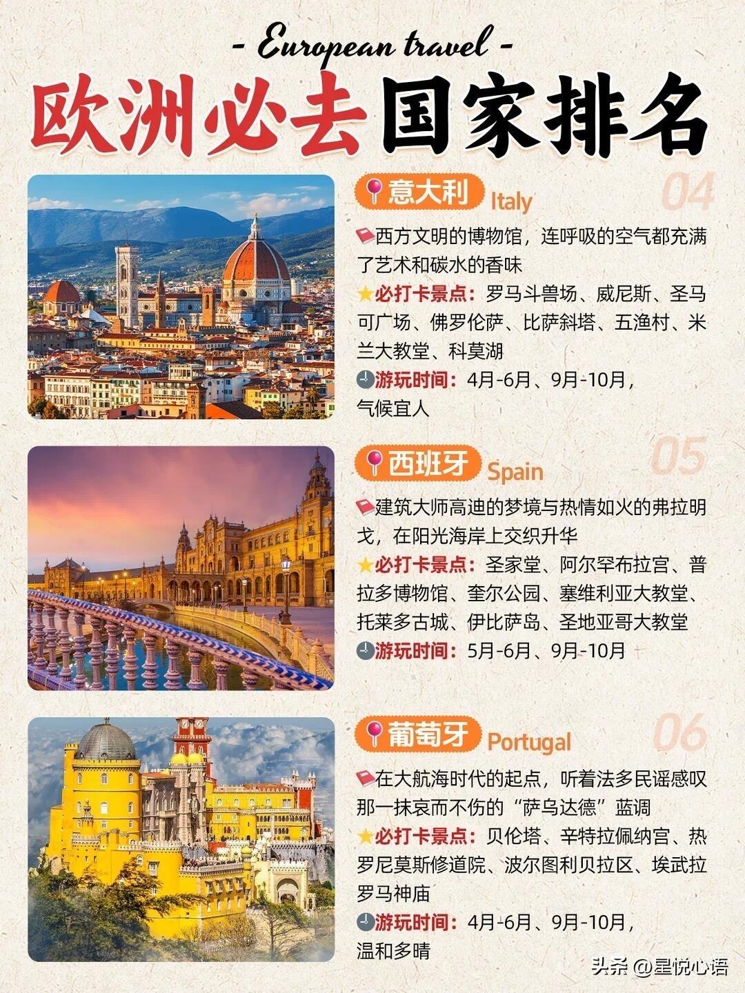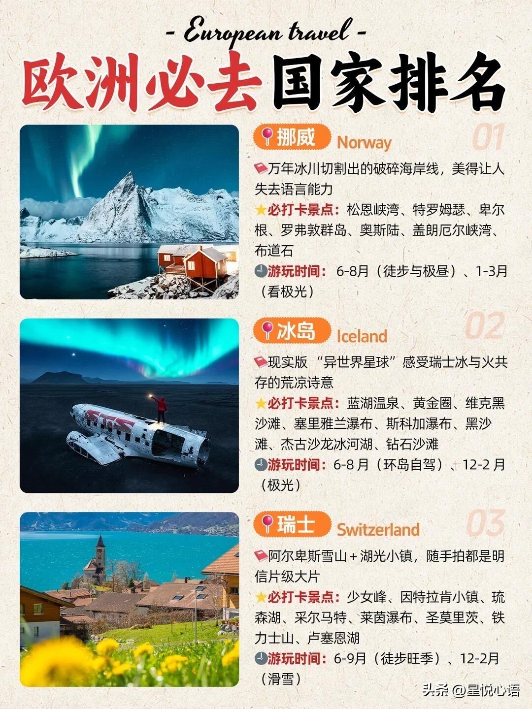 欧洲必去的国家盘点来了! 每一个都各有特色,逛起来超有味道。 挪威的海岸线美到失语,冰川峡湾超震撼。 1-3月看极光,6-8月徒步看极昼,怎么玩都好。 冰岛像异世界,冰河湖、黑沙滩超有画面感, 环岛自驾或者追极光,体验感直接拉满。 瑞士的雪山小镇绝了,随手拍都是大片, 夏天徒步冬天滑雪,四季都有不一样的美。 意大利满是艺术感,斗兽场、威尼斯超有底蕴, 还能吃遍正宗意式美食,碳水快乐拉满。 西班牙超热情,高迪的建筑独具特色, 弗拉明戈舞超有感染力,逛着超有氛围。 法国的浪漫刻在骨子里,埃菲尔铁塔、卢浮宫, 随便走走都能感受到满满的法式风情。 欧洲这几个国家各有千秋, 选对时间去,体验感直接翻倍, 收藏起来,下次旅行直接安排!