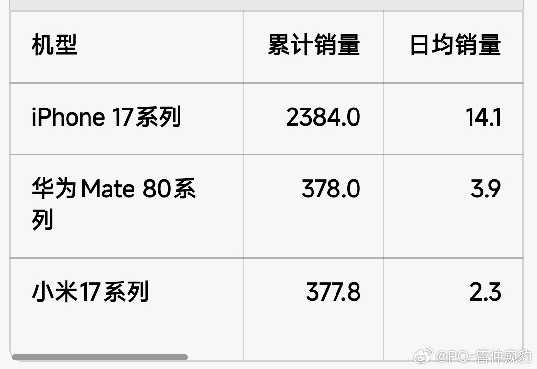 中国市场截止2026W9,iPhone17系列总销量高达2383.97W(开售163天),日均14.1W作为对比华为Mate80系列,377.96W(开售87天),日均3.9W小米17系列,377.8W,日均2.3W