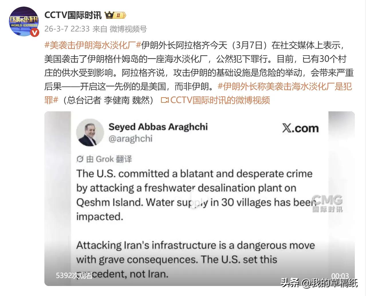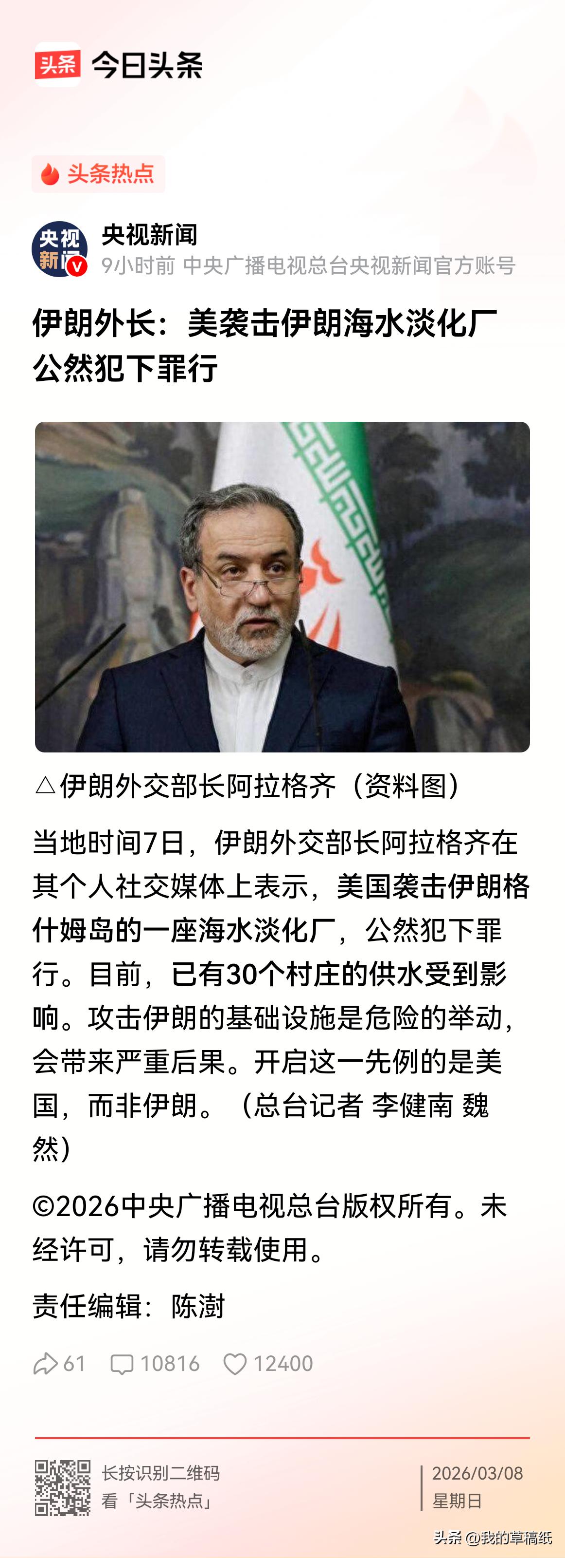 突发!美国袭击伊朗海水淡化厂造成30个村庄断水。 伊外长怒斥:这是犯罪! 当地时间3月7日,伊朗外长阿拉格齐重磅发声,严厉谴责美军袭击伊朗格什姆岛海水淡化厂,直指这一行为是公然犯罪。 袭击已造成伊朗30个村庄供水中断,严重危及平民基本生活。阿拉格齐明确指出,攻击民生基础设施是极度危险举动,必将引发严重后果,而开启这一危险先例的正是美国,绝非伊朗。 此次袭击直击伊朗民生命脉,违背国际法基本准则,加剧地区紧张局势。伊朗方面强调,将坚决捍卫国家主权与民众利益,美方必须为此次危险行径承担全部责任。中东局势持续紧绷,冲突升级风险一触即发。