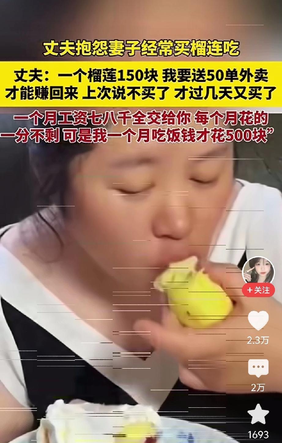 一个榴莲150,我要送50单外卖才能赚回来! 江西这对夫妻,老公辛辛苦苦跑外卖,一个月挣的钱几乎全上交,给老婆七八千,自己一个月饭钱才留500块! 结果老婆倒好,隔三差五就买榴莲吃,一个就150块,老公要风里来雨里去送50单才能挣回来! 钱月月被花光,老公抱怨两句,老婆还不当回事,眼里完全只有自己,半点看不到老公的辛苦。 老公在外面风吹日晒跑单,省吃俭用舍不得花,老婆在家大手大脚,想吃什么就买什么,完全把老公的付出当成理所当然。 什么夫妻同心、同甘共苦,在她眼里啥也不是! 真的,婚姻从来不是一个人的付出,一个人拼命养家,另一个人肆意挥霍,再深的感情也会被磨没的!