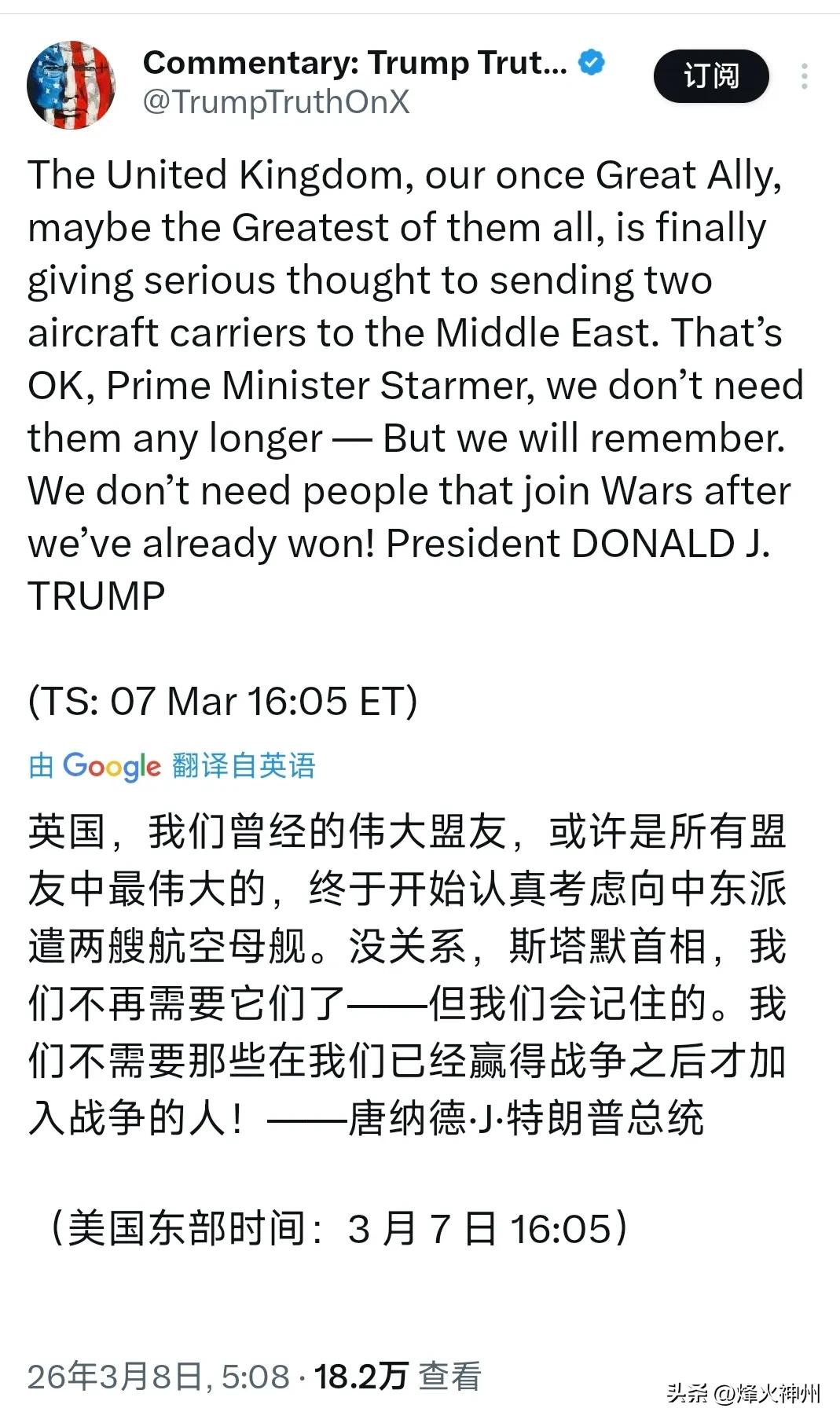 特朗普今天(北京时间3月8日)发文奚落斯塔默:“英国,我们曾经的伟大盟友,或许是所有盟友中最伟大的,终于开始认真考虑向中东派遣两艘航空母舰。没关系,斯塔默首相,我们不再需要它们了——但我们会记住的。我们不需要那些在我们已经赢得战争之后才加入战争的人!” 评几句: 特朗普公开奚落斯塔默与英国航母,一句“我们不再需要它们了”,把美式霸权的功利与凉薄展现得淋漓尽致。战争最艰难时英国犹豫观望,确实让美方不满;但如今局势趋稳便翻脸无情,当众羞辱曾被称作“最伟大盟友”的英国,彻底撕下英美特殊关系的温情面纱。 所谓同盟,在特朗普眼中不过是召之即来、挥之即去的工具。有用时称兄道弟,无用时弃如敝履,“我们会记住的”看似记恩,实则记仇,满是政治算计。 这番表态不仅寒了英国的心,更让所有盟友看清:美国的盟友体系只讲利益,不讲情义。当领袖只懂用人、不懂容人,再牢固的伙伴关系也会在傲慢中崩塌。特朗普赢了一时口舌,却输掉了最珍贵的同盟信任。