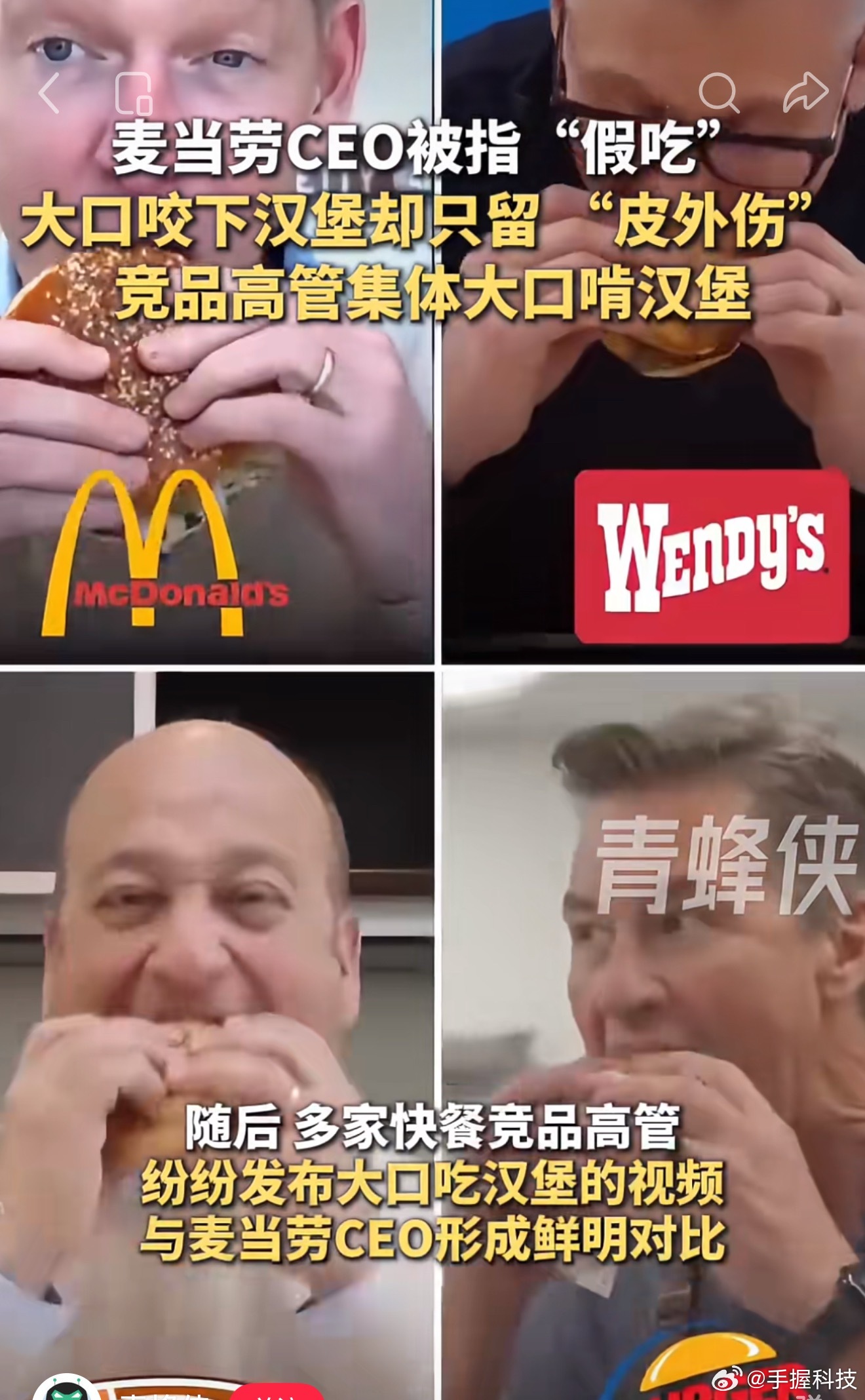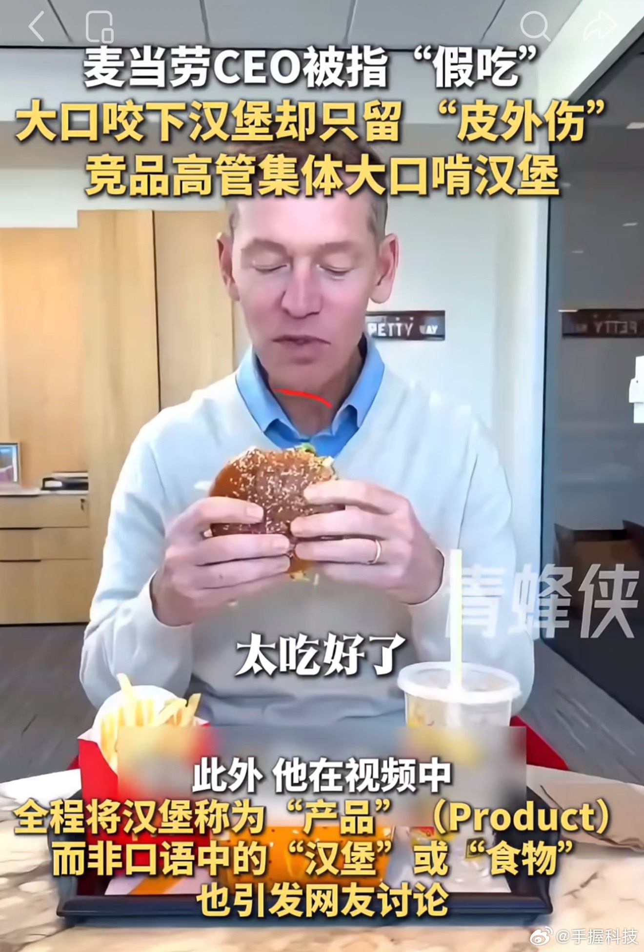 麦当劳CEO被质疑多次假吃吐掉汉堡麦当劳吃的感觉像孕妇在怀孕期间孕吐,看什么都不想吃,勉强咬一口食物,是怕营养不良不得不逼着自己吃的。其他四位,有点像正常情况下,早上工作没来得及吃早餐,中午来个汉堡赶紧垫一垫的感觉。