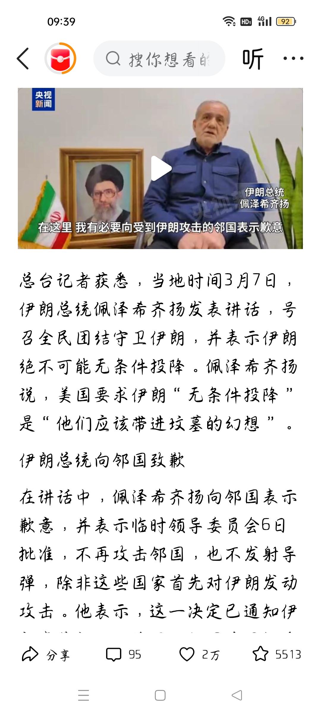 绝不可能无条件投降,我想说 据相关网络报道,伊朗总统佩泽希齐扬发表讲话,号召全民团结守卫伊朗,并表示绝不可能无条件投降,美国要求伊朗“无条件投降"应该是他们带进坟墓的幻想,我想说,伊朗总统这一讲话表达了这层意思,伊朗可以有条件地投降。美国总统特朗普肯定是恐吓,宣布伊朗要无条件投降,要是打不下,美国肯定会给一定条件,扶植美国支持的政界人物。我说得对吗?欢迎评论。