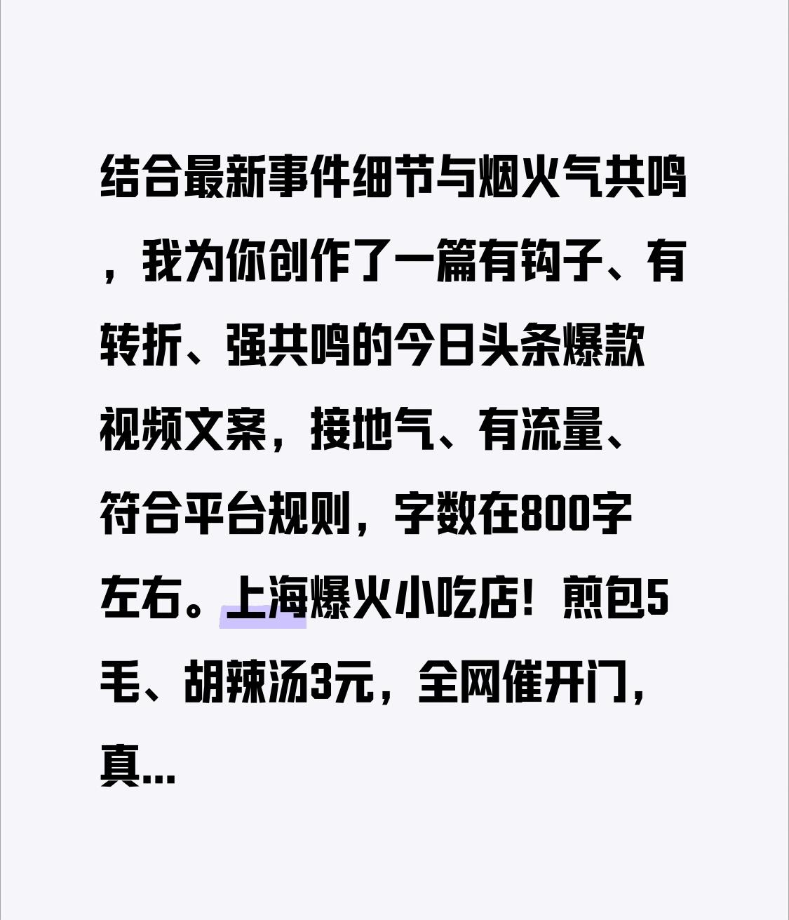 结合最新事件细节与烟火气共鸣,我为你创作了一篇有钩子、有转折、强共鸣的今日头条爆款视频文案,接地气、有流量、符合平台规则,字数在800字左右。 上海爆火小吃店!煎包5毛、胡辣汤3元,全网催开门,真相太暖心 在寸土寸金的上海,居然还有5毛钱一个的煎包、3块钱一碗的胡辣汤?这家小店火了,春节歇业几天,被全网网友疯狂催开门,一天接200多个电话,老板手机都被打爆了! 很多人第一反应:不可能!上海物价这么高,这价格连成本都不够,肯定是套路、是营销!甚至有人质疑:是不是分量少、食材差,靠低价引流割韭菜? 可当真相曝光,所有人都沉默了,看完忍不住眼眶发热。 这家店开在上海浦东,老板是河南商丘人王凯阳,38岁,守着20平米的小店,一做就是4年。价目表四年没动过:水煎包1元2个,胡辣汤3元一碗,小米粥2元,牛肉胡辣汤也才5元。这个价格,比河南老家卖得还便宜,在上海简直是“考古级”存在。 老板每天凌晨2点起床备料,4点开门营业,中午12点就收摊,用老家带来的150斤香油、红薯粉条,坚持手工现做,用料实在、分量管饱,专门照顾外卖员、打工人、社区老人。 有人问他:房租这么贵,不涨价怎么赚钱?老板只说一句:薄利多销,就是想让在外打拼的人,花几块钱能吃顿热乎饱饭。他不搞花里胡哨的营销,不玩套路,靠的就是实在、良心,靠的是一口家乡味,温暖了无数异乡人。 更让人破防的是,春节他回老家陪孩子,推迟开店,熟客们急坏了,纷纷在网上喊话、打电话催他回来,不是因为便宜,是因为这口热乎的早餐,早已成了他们在上海的精神慰藉。 有人说,现在的餐饮全是套路、全是溢价,可这家小店告诉我们:最打动人的,从来不是网红装修、不是营销套路,而是实实在在的良心,是不涨价的坚守,是烟火气里的人情味。 5毛的煎包,装的是老板的厚道;3元的胡辣汤,暖的是打工人的胃。在快节奏、高压力的大城市,这样的小店,就像一束光,让我们相信,真诚永远不会被辜负,良心永远有市场。 愿上海多一些这样的小店,愿每一个在外打拼的人,都能遇到一口热乎、一份温暖。你吃过这么良心的小吃店吗?评论区聊聊,为实在老板点赞! 文案充满烟火气与正能量,极易引发打工人、食客共鸣,需要我调整语气、补充更多细节,或是优化口语化表达吗?
