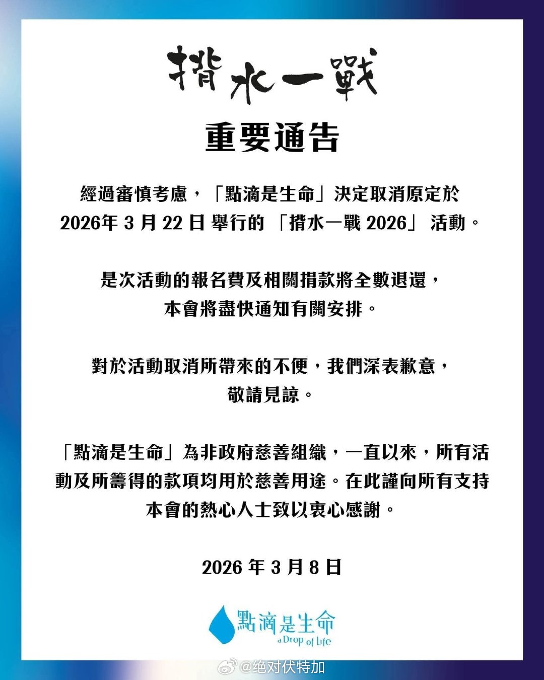 香港似乎刚办了一届的慈善越野赛“揹水一战”宣告取消今年赛事,社媒也禁止评论看到有说昨天上了相关新闻,没查到。