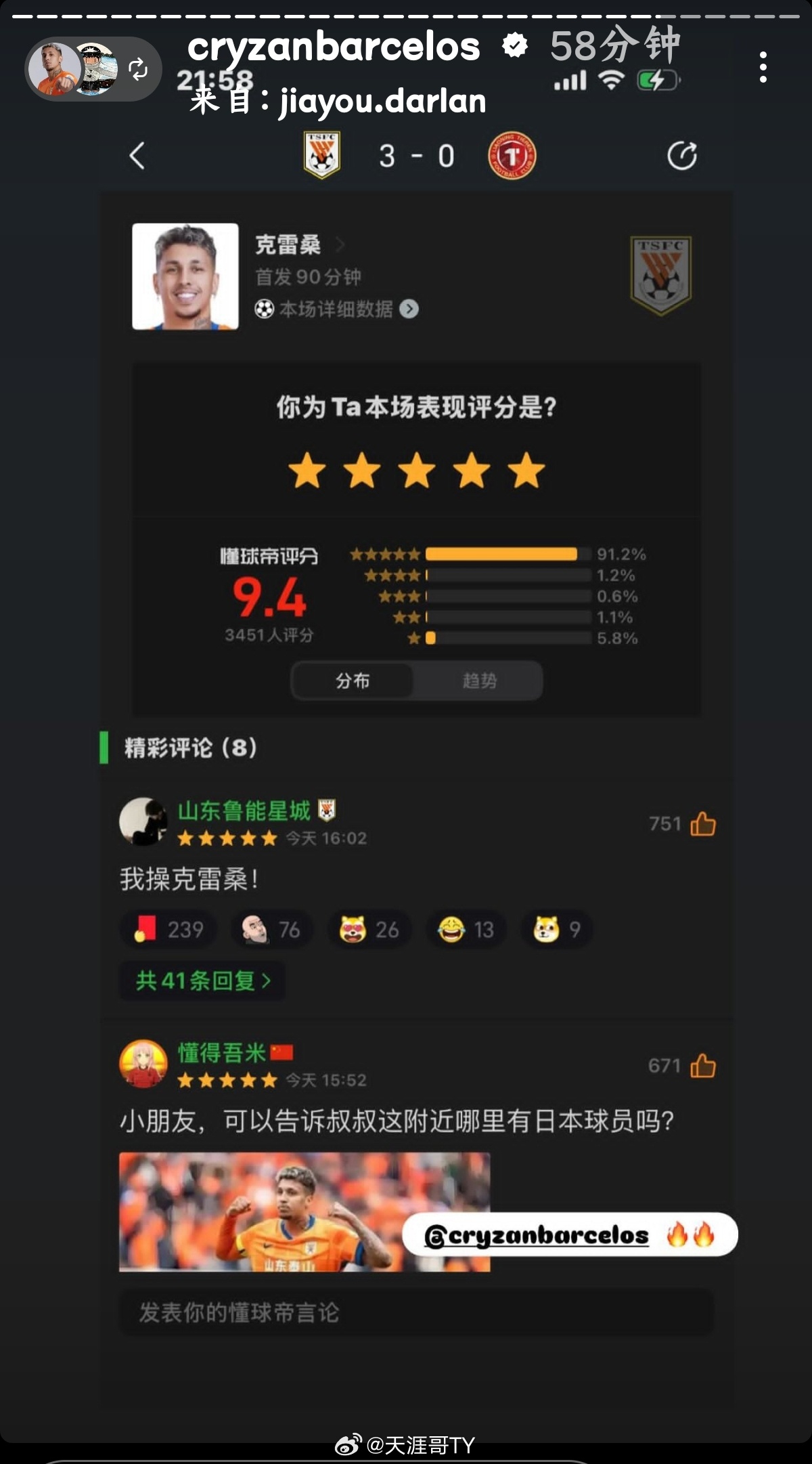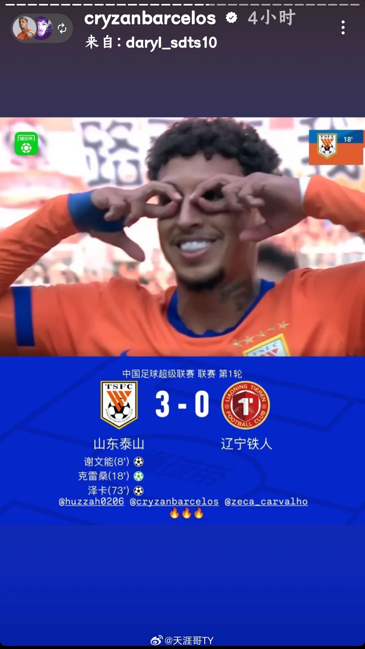 山东泰山/ 山东泰山外援动态 昨天赛后,克雷桑更新动态。看来对昨天自己表现还算满意对于克雷桑昨天表现,你们满意吗?我的主队我的城