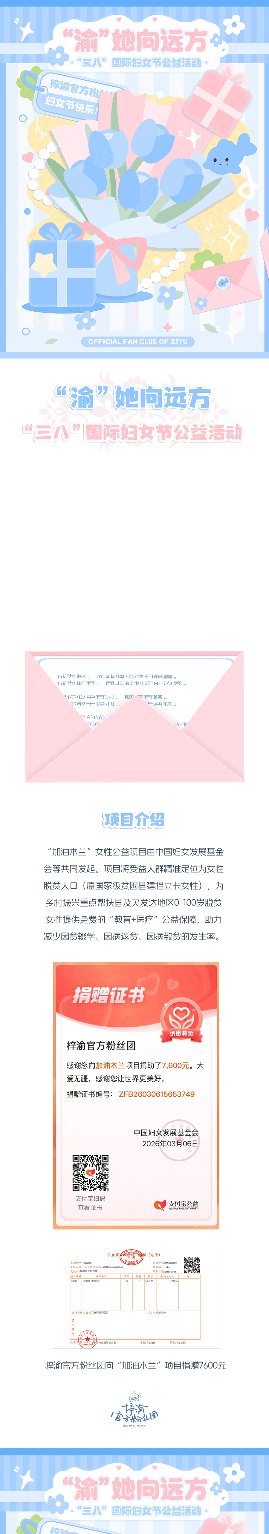 梓渝粉丝妇女节公益活动梓渝官方粉丝团“三八”国际妇女节公益活动捐赠7600元参与“加油木兰”公益项目,为乡村振兴重点帮扶地区的女性送去一份关于教育与健康的守护。