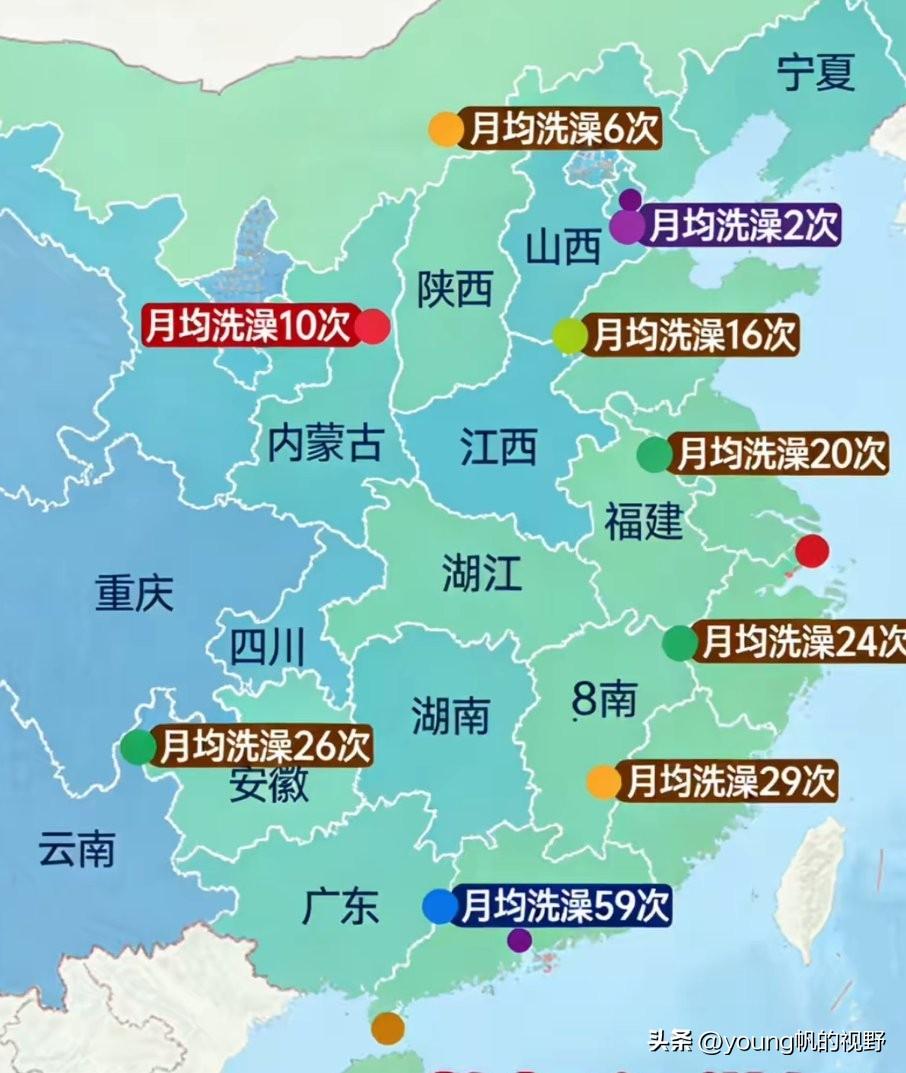 有网友制作的全国不同省份人们的月均洗澡次数图。从数据来看,华南三兄弟是最频繁的,基本上每天都洗澡,这也符合当地人生活习惯,毕竟华南三兄弟的气候都是比较湿热的,不洗澡真的不舒服。但广东的洗澡数达到了59次,远高于广西与海南,这就有点夸张了吧?正常应该是三兄弟差不多才对吧?并且其他一些省的月均洗澡数才那么少吗?这也有点不太可能吧?不知道网友是怎么统计数据的呢?不过这也只是一个仅供娱乐的话题而已,也不用太较真就行了。[呲牙][呲牙]