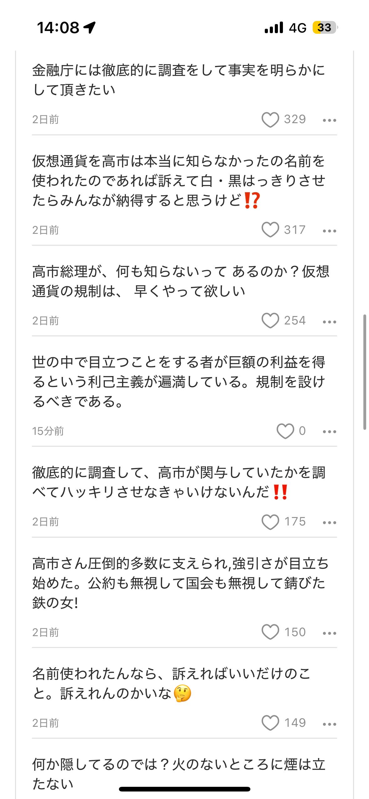 对于前几天因高市发X文说和她无关的以高市名字发行的虚拟货币,看看日本民众怎么说。 —————————————————— 希望金融厅能彻底调查清楚事实真相。 329 高市对加密货币真的一无所知吗?如果名字被冒用了,去起诉不就清楚了吗?这样大家也就信服了。 317 高市总理声称毫不知情,这真的可能吗?希望加密货币的监管能尽快推行。 254 必须彻底调查,查清楚高市是否涉及其中,必须给个明确的交代! 175 高市在压倒性的支持中,其强硬态度逐渐凸显。她无视承诺,无视国会,简直就是生锈的铁娘子! 150 如果名字被冒用了,起诉不就得了。问题是,她能起诉吗?🤔 148 是不是在隐藏什么?无风不起浪啊。 145 有责任彻底调查,确认是否真的没有关联,并向国民做出合理解释。 96 高市的责任很大。 93 这是迟早会发生的事件。加密货币的机制复杂,上当受骗的人越来越多,必须让它变得更加容易理解。 0 这并非高市总理的问题,而是沟通方面的问题。指责高市一方的人,思维有些奇怪。应该从根本上重新审视。 83 对加密货币不感兴趣。 0 贪小便宜的人总会吃亏。✖️ 0 那种新的加密资产代币,不过是为了快速套现的资产罢了。 1 高市总理应该认命,辞去议员职务才对! 68 难道和森友学园事件一样,只是名字被冒用了?这件事也会不了了之吗? 65 对高市总理来说,即使知道,也只不过是无数“高市”借名生意中的一个吧。 1 这似乎是欺骗金融厅发行的,难道不违法吗?! 0 怎么可能不知道。这可是自民党的拿手好戏! 52 利用名人时,要么动作极其缓慢,要么根本不行动。可轮到自己被利用时,动作却如此迅速。高市女士。