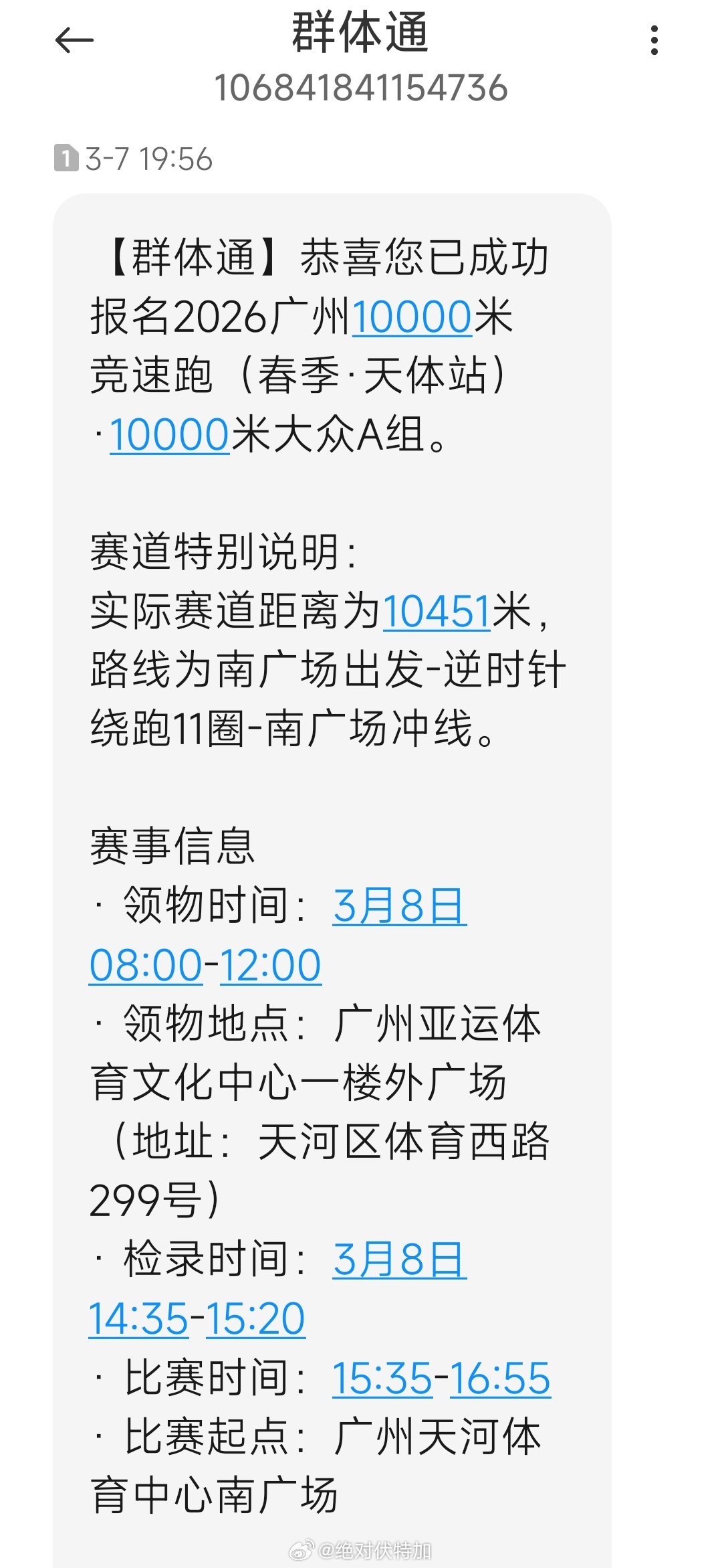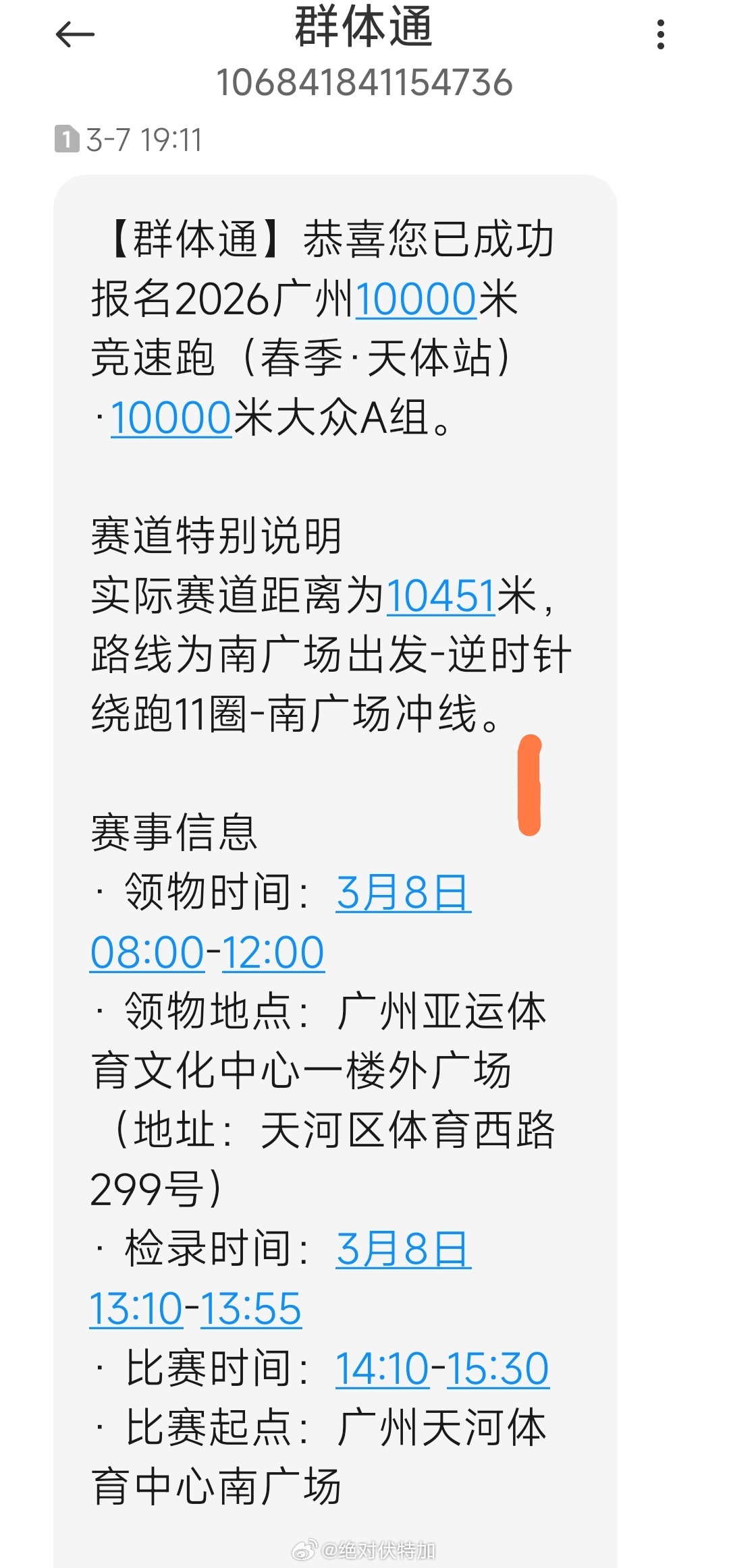 2026广州10000米竞速跑(春季·天体站)目前已经是我在广州境内见过最烂的赛事了比赛时间尴尬,本想着跑完了再吃午饭,结果进检录区才发现比赛时间推迟了。昨天发过两次通知短信,第二条做了更改。虽然最早看竞赛规程就在盘算橙马体育能怎么能在原定时间表安排出来,没想到临比赛不到24小时还能耍选手一次。回头我总要写个赛评,在思考这比赛有什么正面角度可以写