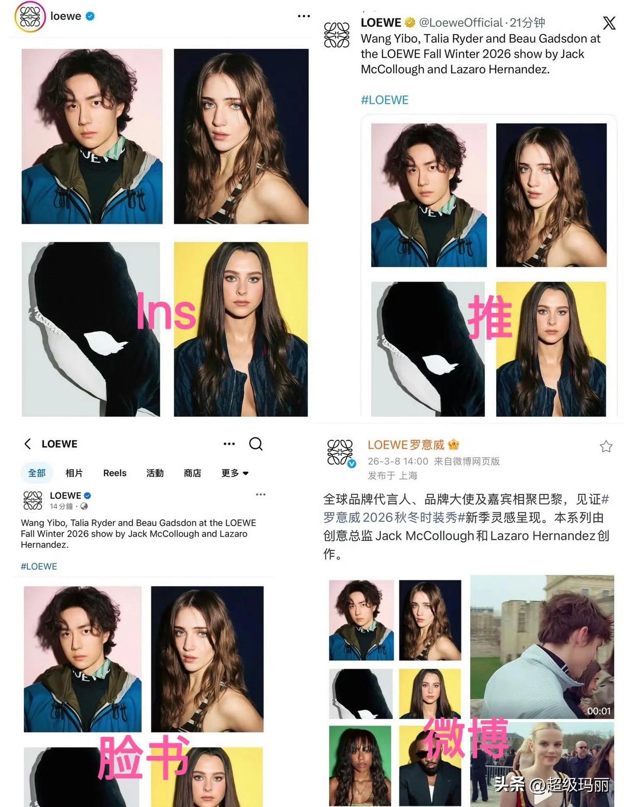 Loewe国内外全平台(脸书,ins,推,围脖)首位认领王一博, 王一博是罗意威FB上唯一认领的亚洲艺人,X和 INS上唯一认领的中!国艺人。 除了王一博以外的亚洲艺人即使被提及也只存在于品牌发布的多人入场视频。【罗意威全球品牌代言人】王一博罗意威大秀待遇明明白白的最顶,忌越级碰瓷[大金牙]