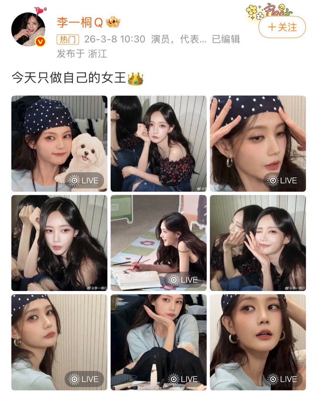 李一桐今天只做自己的女王 波点发带、露肩碎花造型好美,多面随拍满是自在气场。