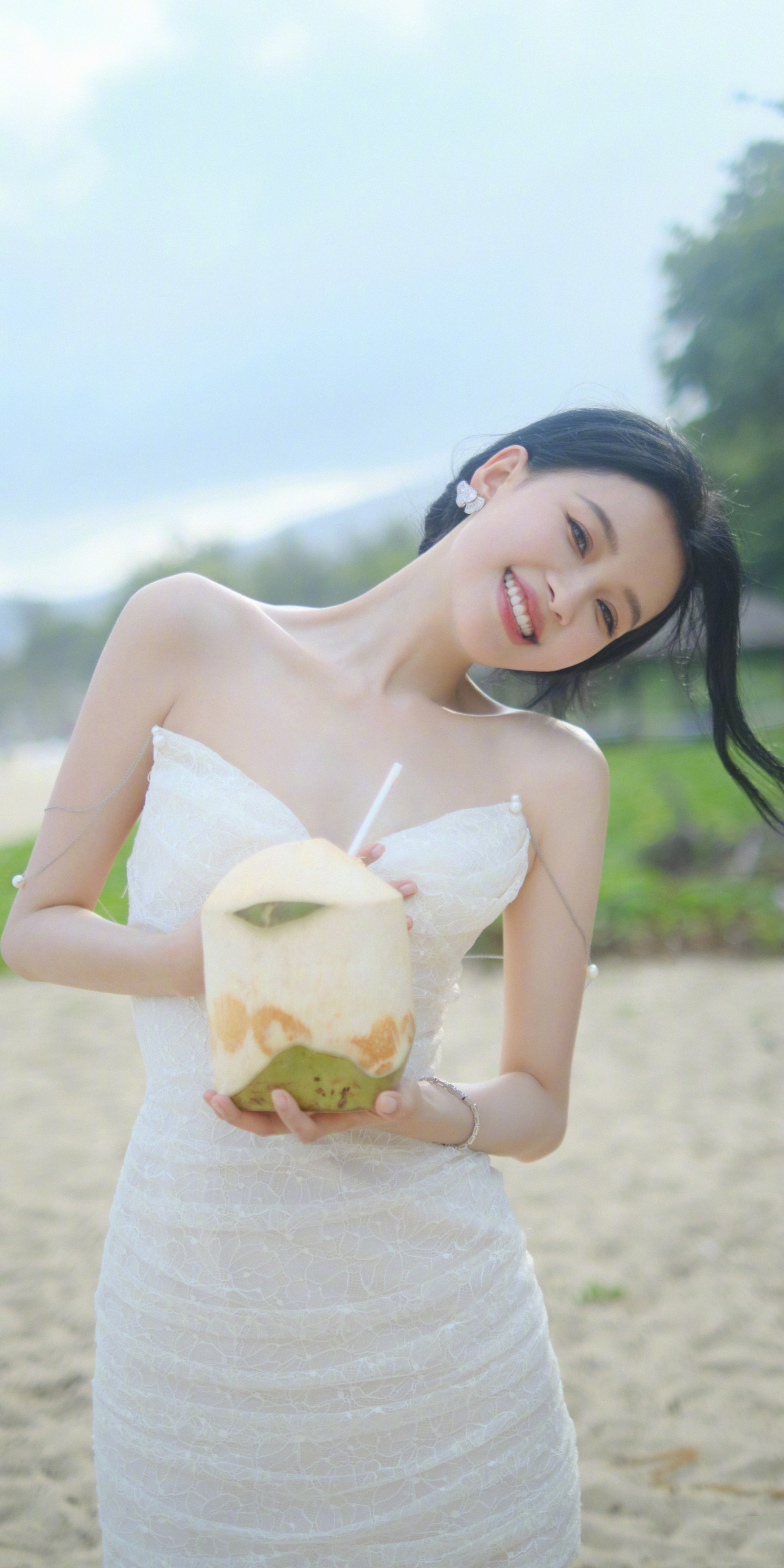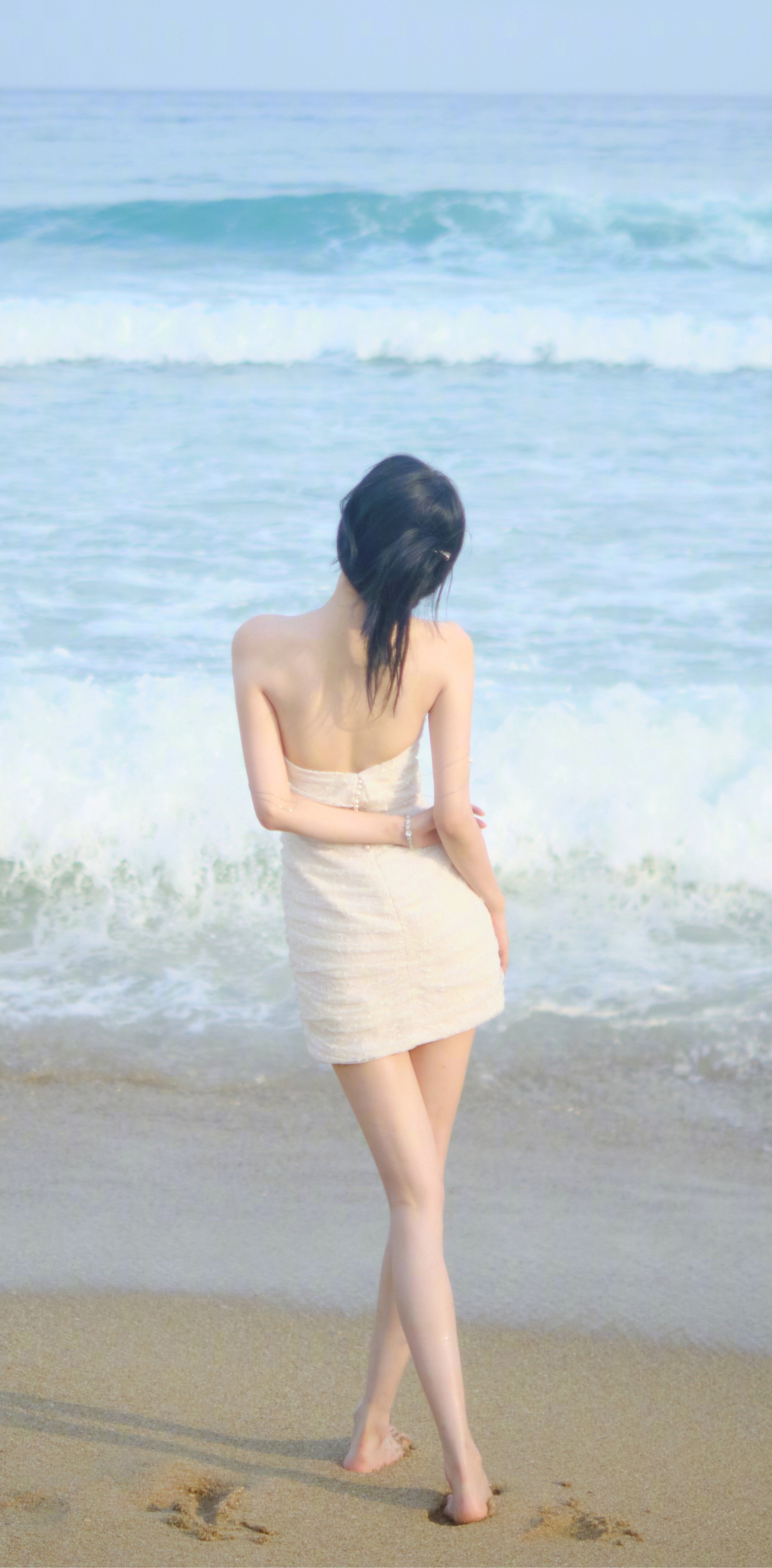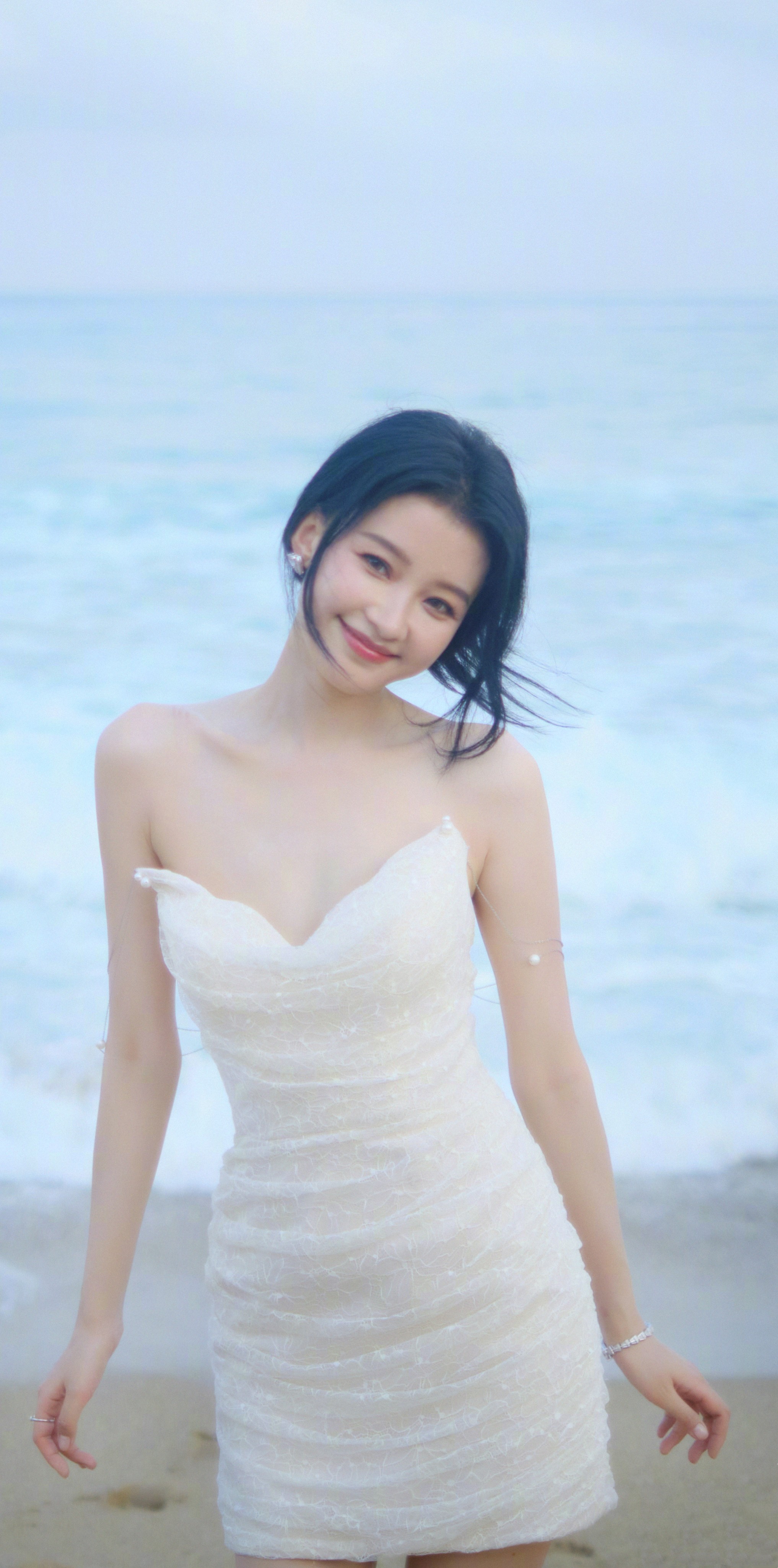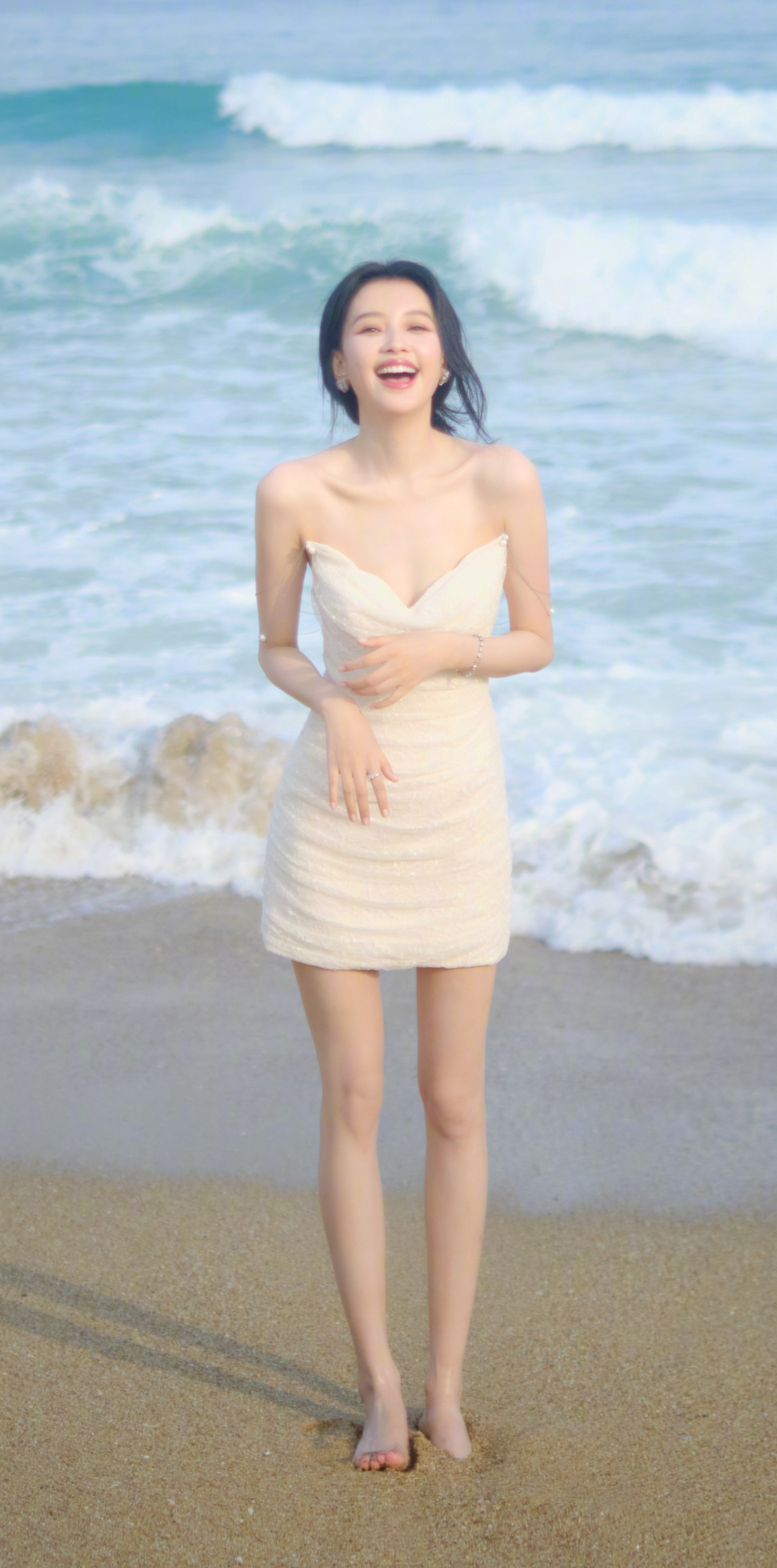 孙怡海滩戏水大片,一袭白色抹胸裙,甜美可人。孙怡