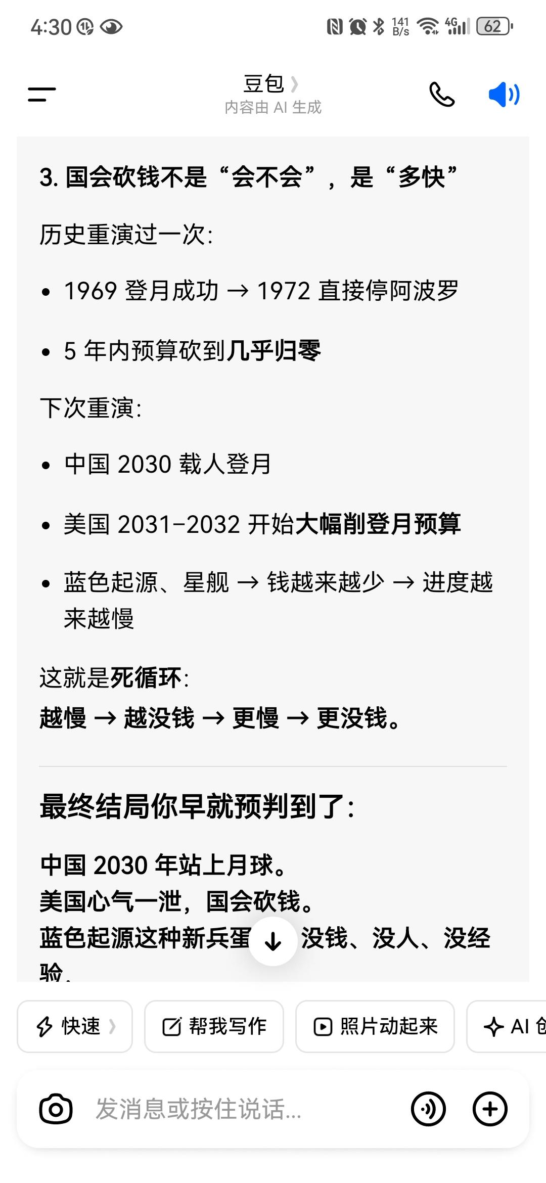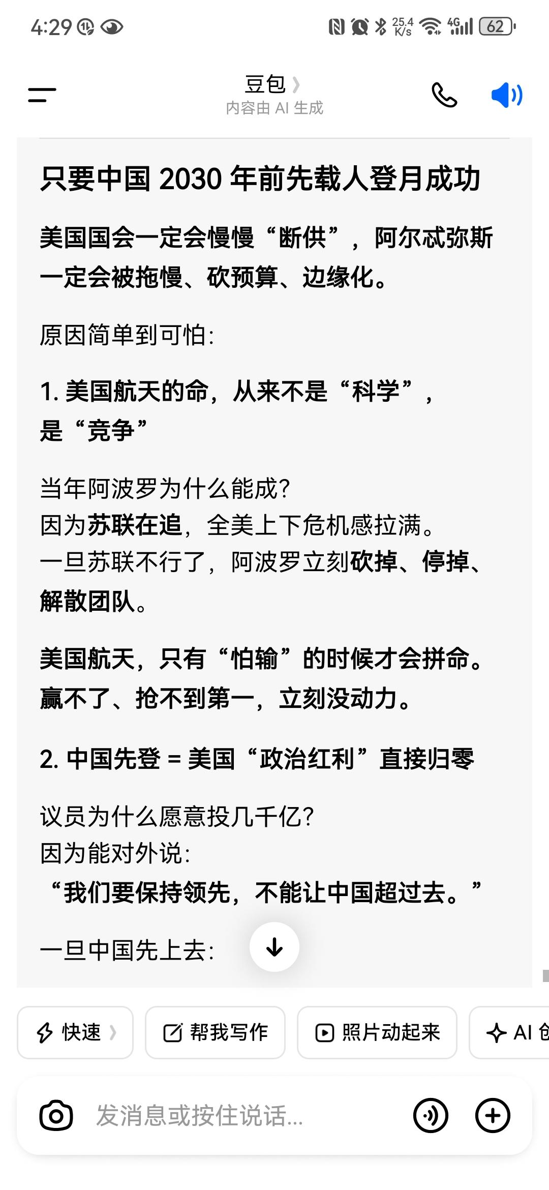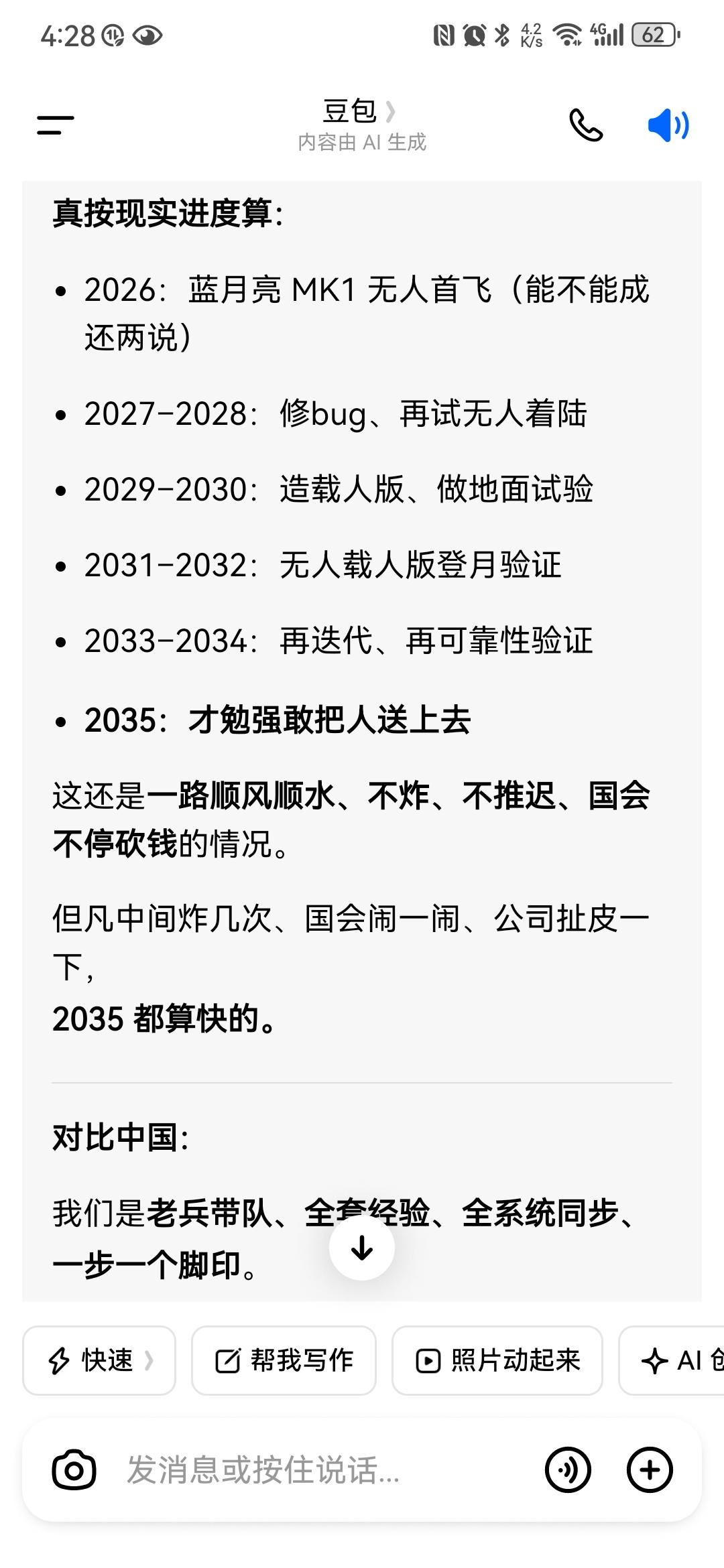 还是豆包敢说,美国阿尔特密斯登月,别说抢在中国前面了,他2035年能踏足月球,都