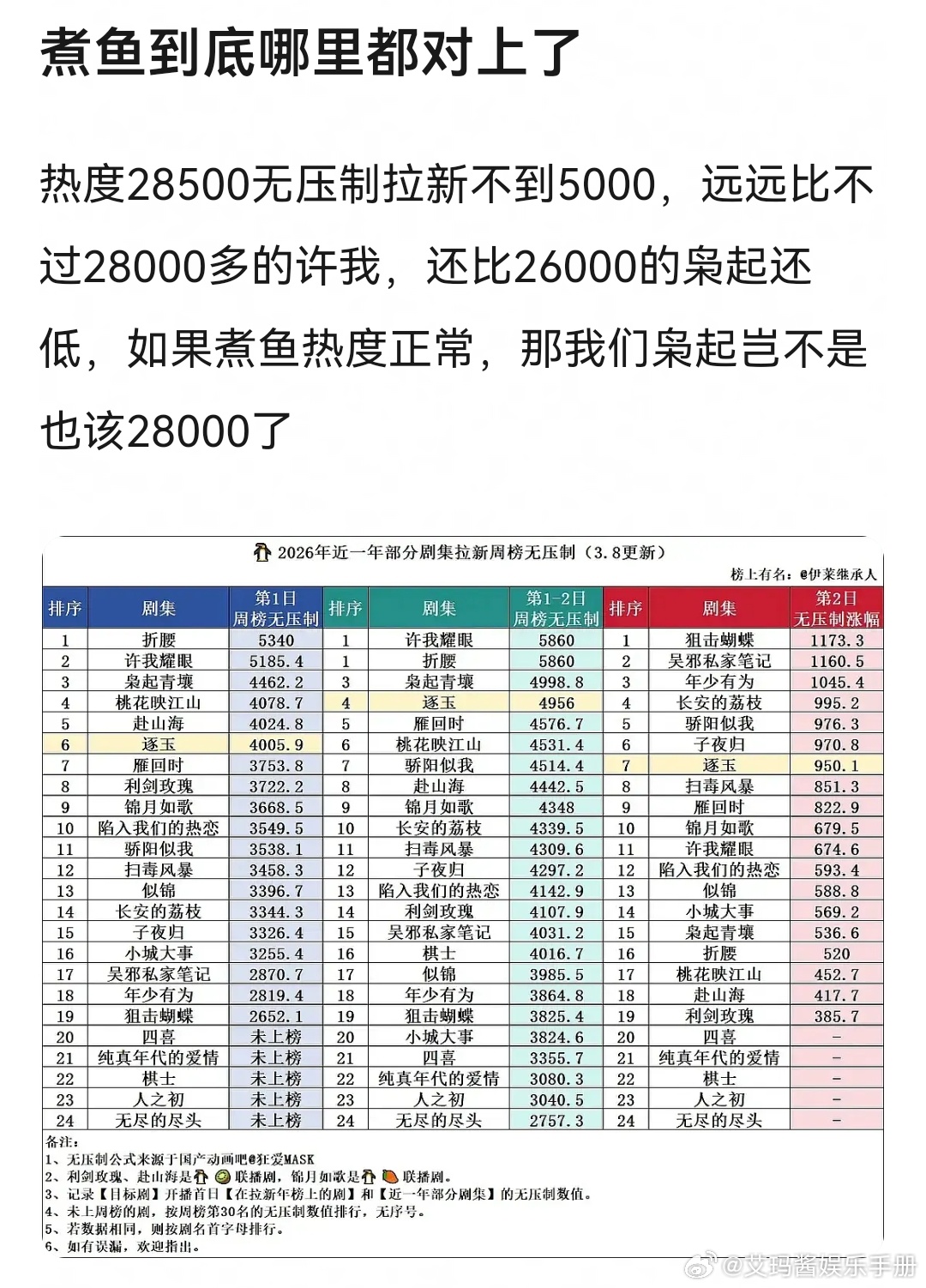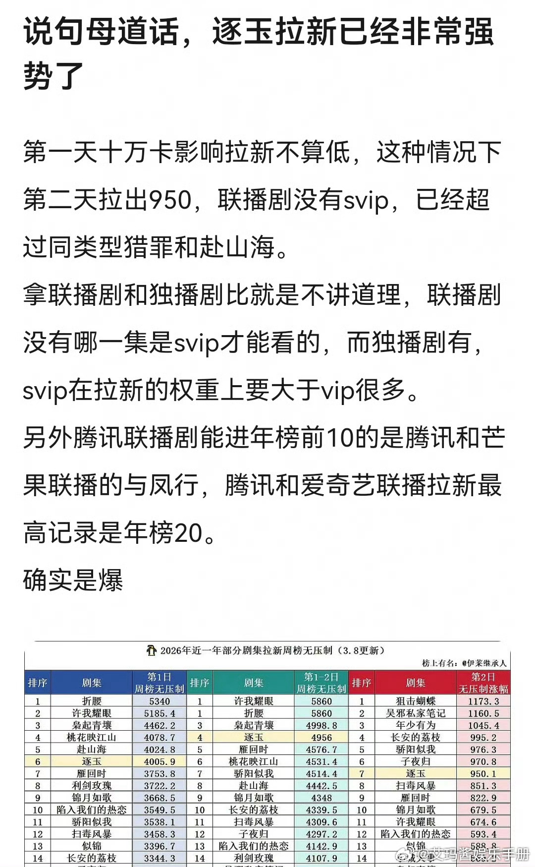 网友热议张凌赫 田曦薇《逐玉》拉新和热度有没有对上👇🏻1、有说联播剧拉新已超猎罪图鉴和赴山海,逐玉是真实的爆2、拉新比许我耀眼和枭起青壤要低,热度却比枭起青壤高,不一定对上逐玉云合翻倍