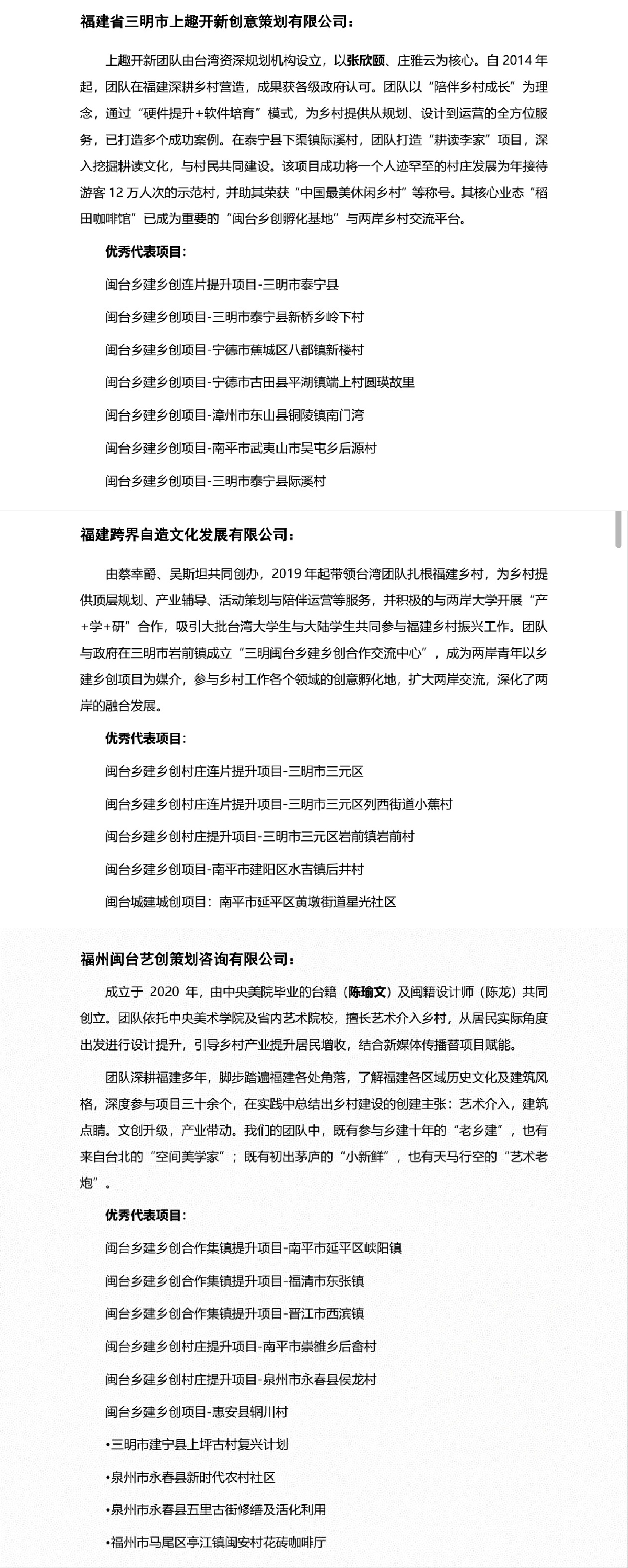 2018年 ,为解决乡村建设专业人才匮乏问题, 住房城乡建设部开展了“设计下乡”工作,福建省因地制宜,创新了闽台乡建乡创工作,引入台湾建筑师,升级为两岸融合载体,目前有600多位台湾建筑师活跃在八闽乡村,开展设计下乡驻村陪伴式服务。传统村落守护计划乡村振兴新思路