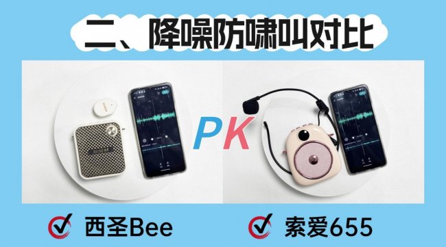 (2)索爱655头戴有线扩音器索爱655同样具备扎实的音质基础,麦克风采用单指向收音设计,能精准聚焦正前方人声,对周边环境噪音有一定的过滤效果,适合在相对安静的场景使用。发声上配备2.5寸稀土强磁大喇叭,声音响度充足,低频表现较为扎实,整体音质稳定耐用。不过受限于单指向收音特性,收音角度相对固定,轻微移动位置就可能导致人声拾音清晰度下降,且发声单元的频带覆盖度和人声优化表现,相比西圣Bee的全向收音+动态调控方案,细节表现会稍显普通。二、降噪防啸叫对比