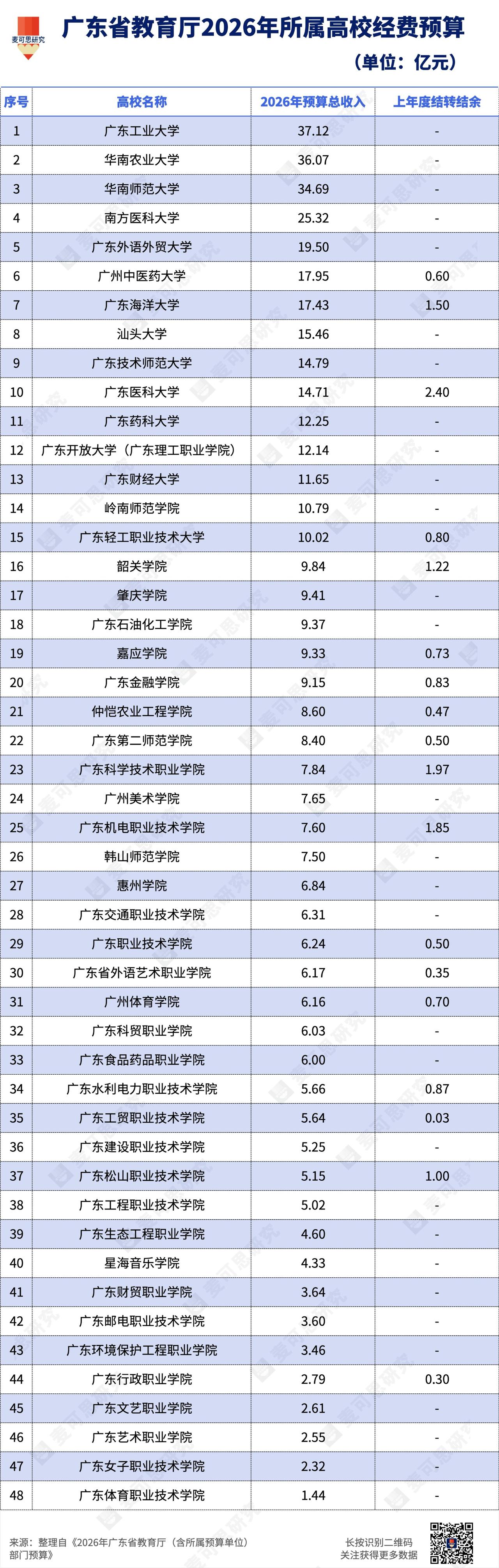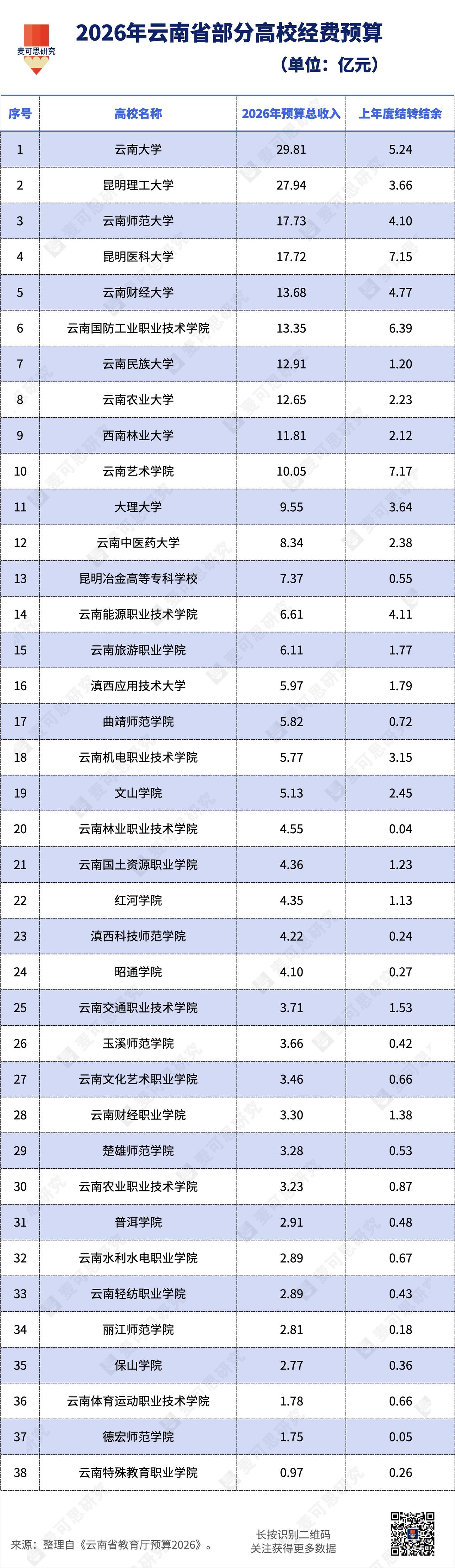 从2026年高校预算看最有希望晋升“双一流”的院校 经济基础决定上层建筑,高校建设亦是如此,好的高校预算自然会高。今年是新一轮“双一流”评选最关键的一年,许多地方对很有希望晋升的高校调高了预算。 比如陕西的西安建筑科技大学、西安理工大学,2026年预算成倍增长,分别达到45.21亿、30.05亿,远远超过了211的西北大学(27.08亿)。经济大省广东也是如此。广东工业大学2026预算达到了37.12亿元,已高出了211的华南师范大学(34.09亿)、双一流的华南农业大学(36.07亿)。 与上述两地相类似的浙江和云南,也提高了2所省属普通高校的预算。2026年浙江工业大学预算,已接近于双一流的宁波大学,为43.50亿元;昆明理工大学,也以27.94亿元,接近于211的云南大学。 与此相反,已公布2026年高校预算的辽宁、江西、新疆,并无突出的普通院校,这是不是各地用预算告诉大家,今年这里并无院校有希望晋升“双一流”。 你所在的省市,是不是也调高了有希望晋升“双一流”高校的预算?