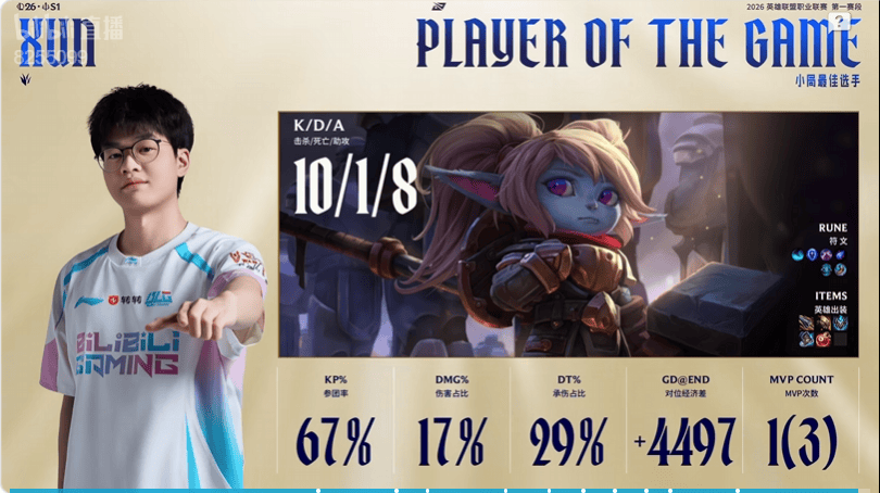 Xun使用波比打出10/1/8战绩,拿到BLG对阵JDG次局比赛MVP