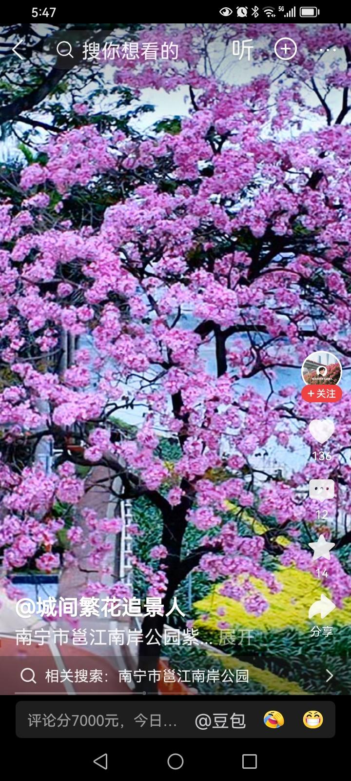 我要赞美你:紫风铃 初春,在邕江堤园 你在枝头荡秋千 摇落一地淡紫的笑声 笑声那样的温柔 微风吹过 就变成圆舞曲的节奏 你是不是披着 晨曦裁的纱巾 为什么每一瓣里 都藏着太阳的金粉 让蜂蝶恋着香气 撞进象铃铛一样的蕊 你便绽放出 粉红色的娇媚 每当微风吹过三月的堤园 你又就象细碎的金光 从灿烂的笑容里抖落的 尽是你粉红色的影子 那阿娜多姿的影子 在风中飘啊飘啊 把整个邕江堤园的初春 渲染得如此让人沉醉