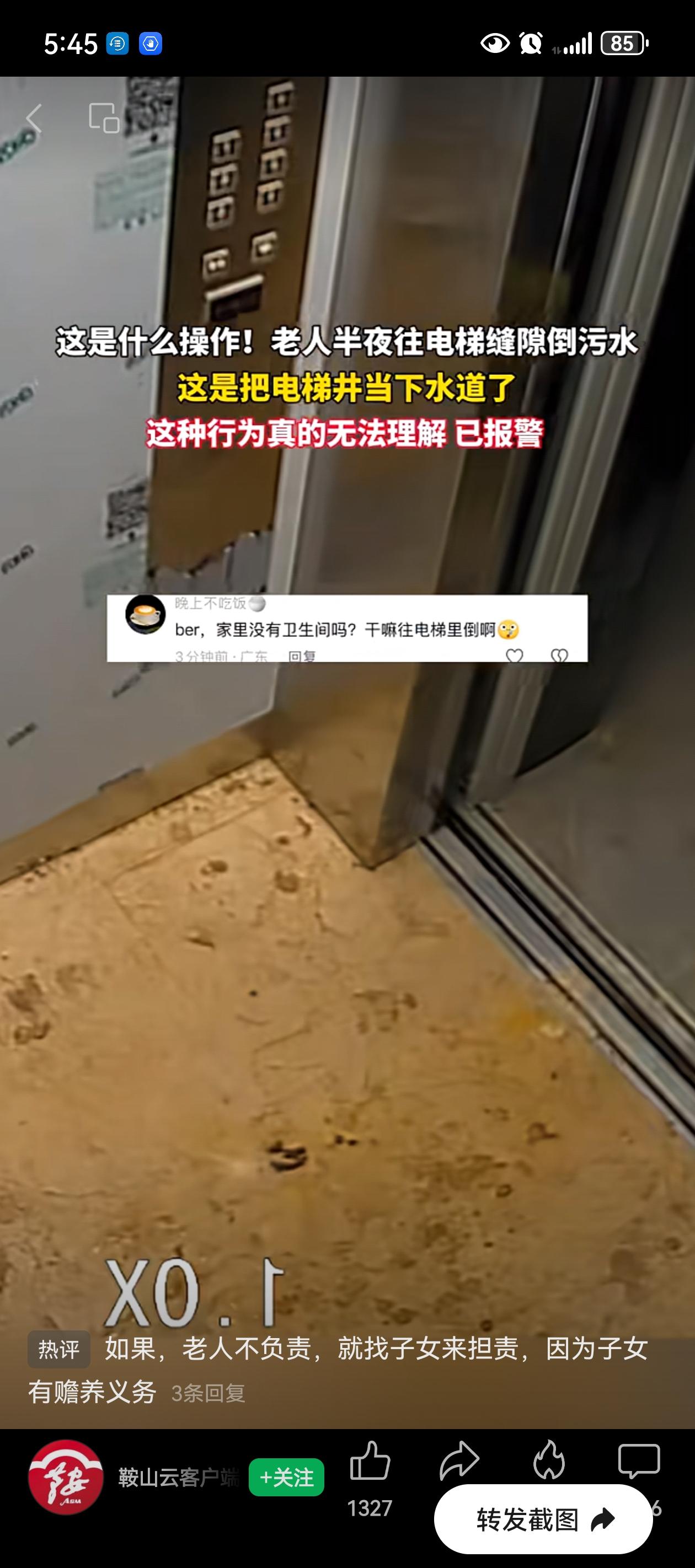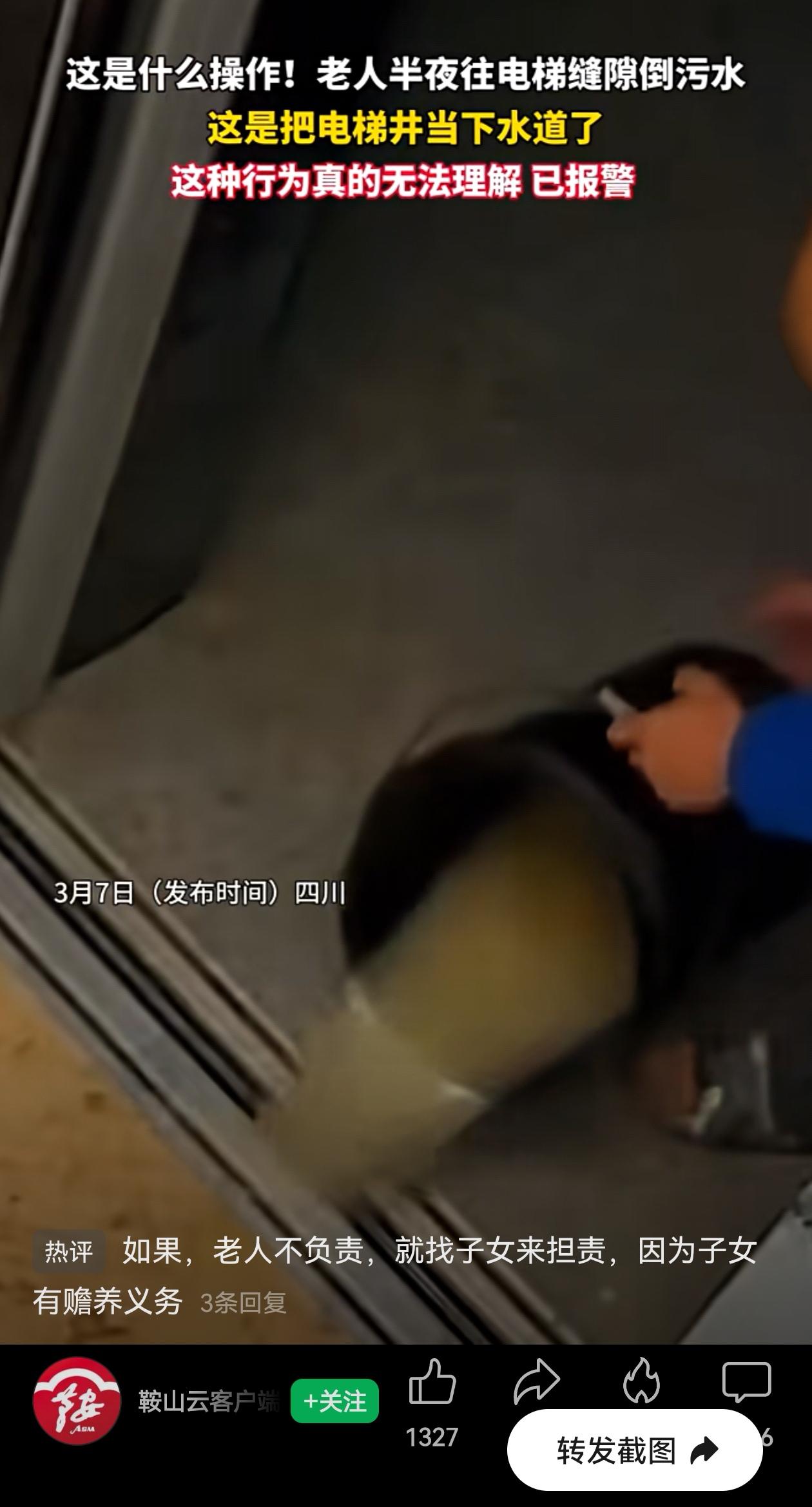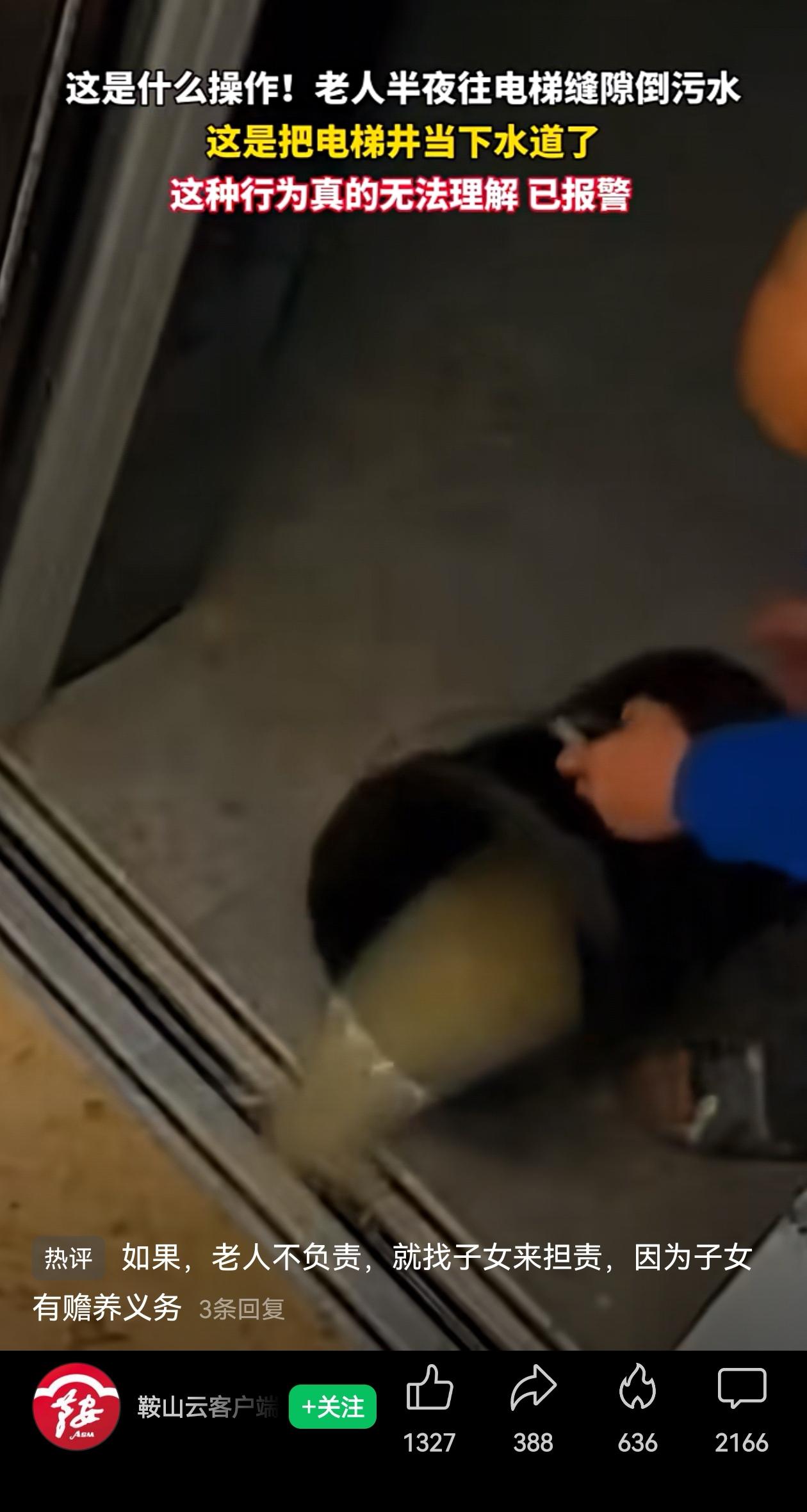 让人目瞪口呆啊!半夜大爷那叫一个淡定从容,拎着桶专门走到电梯口,对准门缝倒下去,污水横流。 要不是监控拍下来,谁能想到电梯故障是这么来的?还以为是设备老化呢? 这位大爷很可能刚搬进电梯楼不久,身子是住进来了,但几十年的生活记忆还没跟上。 在农村院子里,泼水倒脏水都是顺手的事——推开门,往院子里一泼,自然蒸发渗入泥土。 可现在呢?开门不是院子,是走廊,是电梯!只是环境变了,“外面”的概念还没变啊! 理解归理解,后果却很严重。电梯井进水的后果远比往院子里倒水复杂,电路短路、机械生锈、安全隐患,哪一样都得整栋楼买单。 而且从监控看,大爷是特意走到电梯口、对准门缝倒下去的,这已经超出了“顺手”的范围。 让一位习惯了农家院的老人,一夜之间学会所有都市生存法则,需要家人大力帮助啊!这事儿折射出的不只是素质问题,更像是一个时代错位的生活习惯。 小区里的公共设施是大家的共同财产,不是农家院坝,大爷的这事儿给大家提个醒,一时“省事”,可能就是别人的糟心事和安全隐患。 但愿这一桶污水,就当是城市化进程里的一道阵痛吧。只是下次,一定倒在合适的地方啊? 信息来源:鞍山云客户端