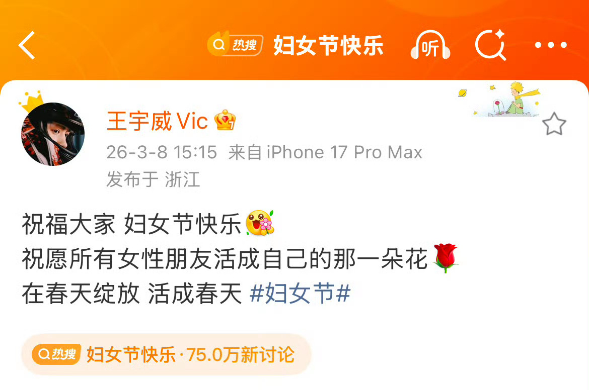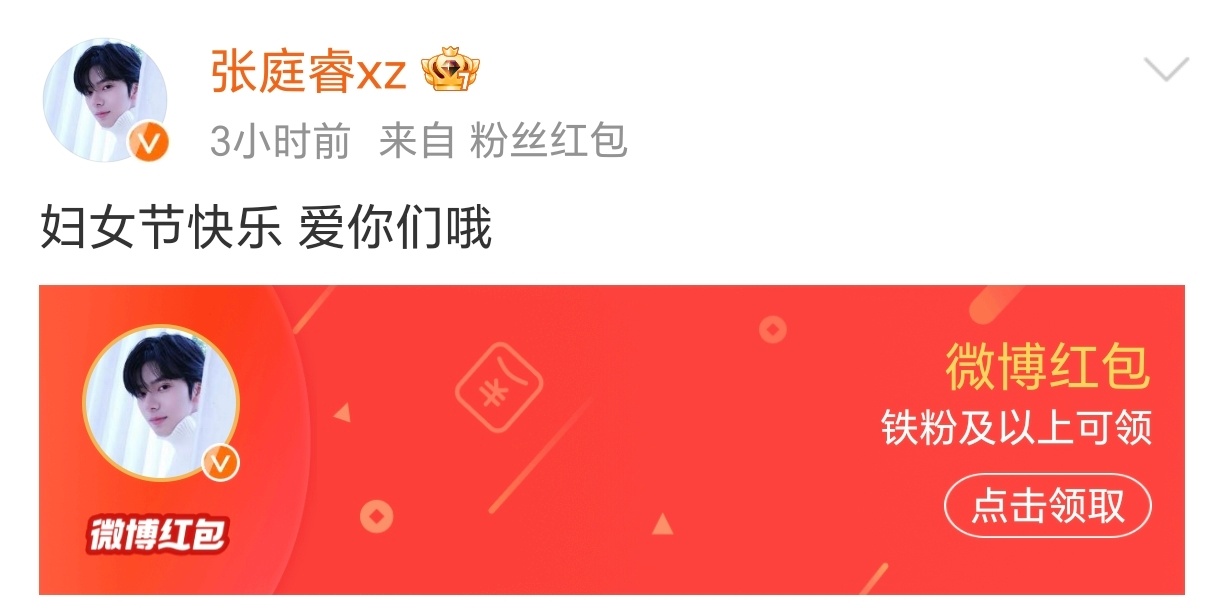 很欣赏这种把粉丝放心上的短男,这种放心上是在妇女节这天送祝福