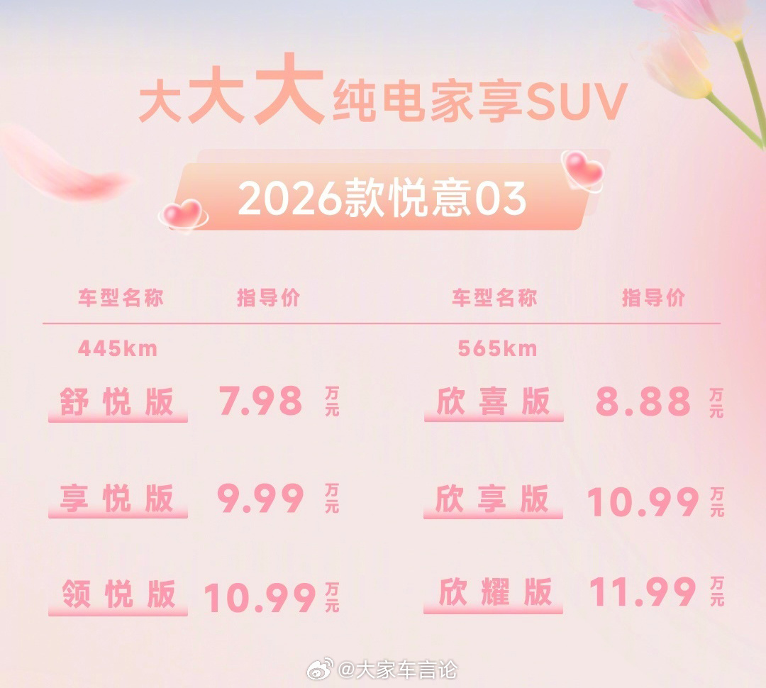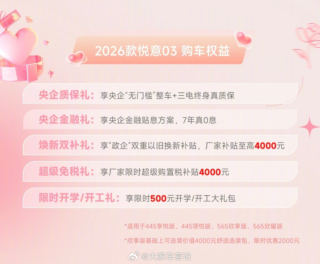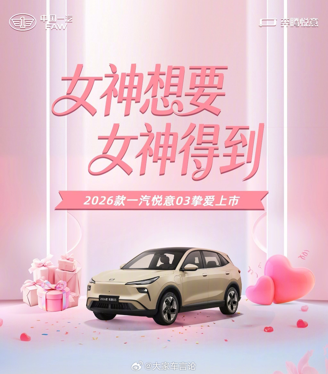 26款一汽奔腾悦意03上市,售价7.98万起。新车6款车型,拥有445km/565km双续航可选,最大功率122kW;拥有如AI大模型语音、座椅加热通风、360°全景影像、并线辅助等从舒适配置到辅助驾驶等多方面20余项升级;目前购车还有7年0息、整车 + 三电终身质保。