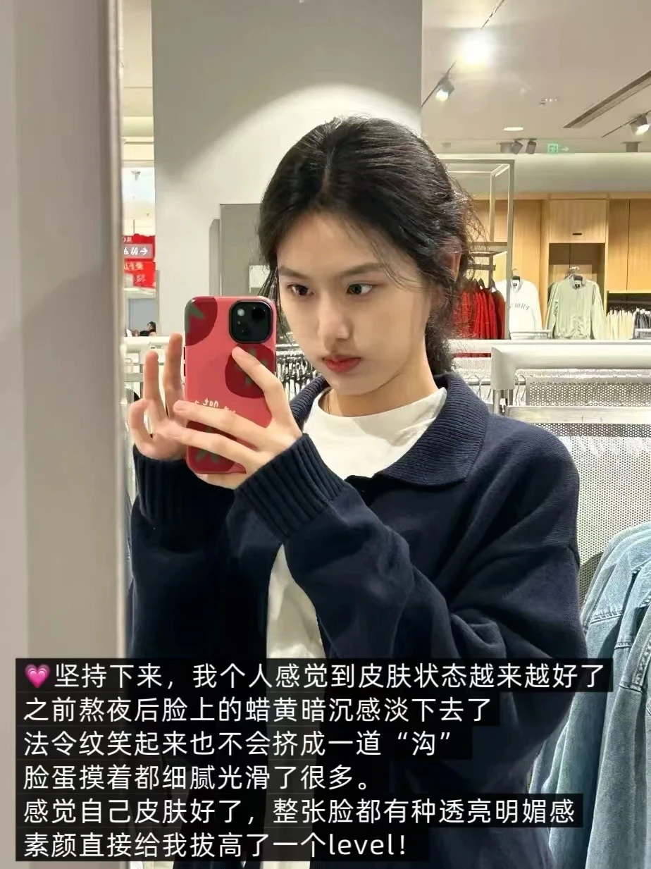 坚持下来,我个人感觉到皮肤状态越来越好了,之前熬夜后脸上的蜡黄暗沉感淡下去了,法令纹笑起来也不会挤成一道“沟”,脸蛋摸着都细腻光滑了很多。
