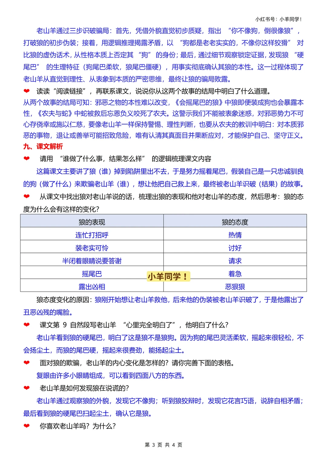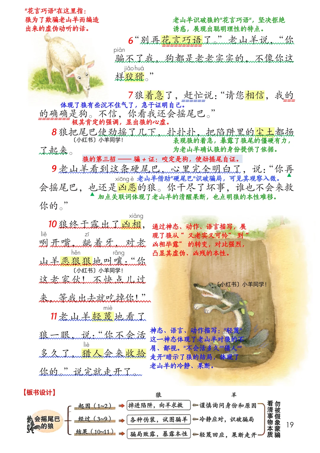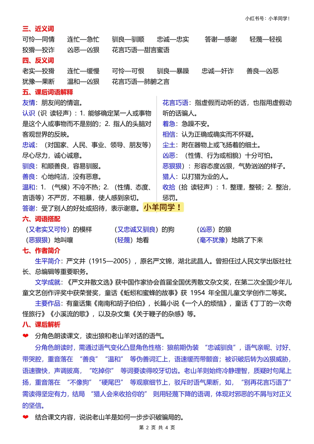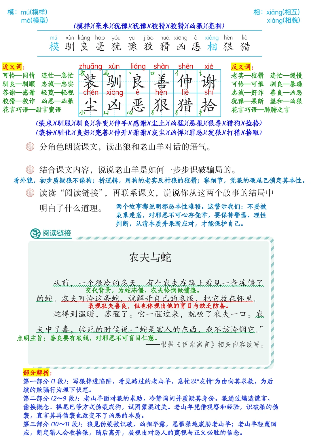 学习目标: 1️⃣生字:认 “模、驯、良”,写 “装、驯”;多音字 “模(mú/mó)、相(xiāng/xiàng)” 要记牢。 2️⃣朗读:分角色读,读出狼的狡猾和老山羊的冷静。 3️⃣道理:坏人本性难移,别被花言巧语和伪装迷惑。