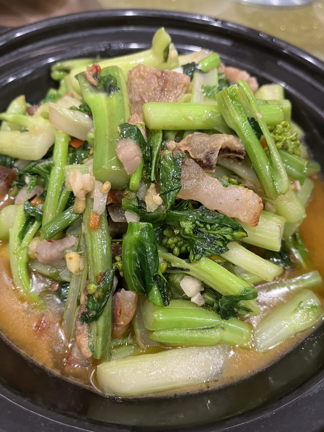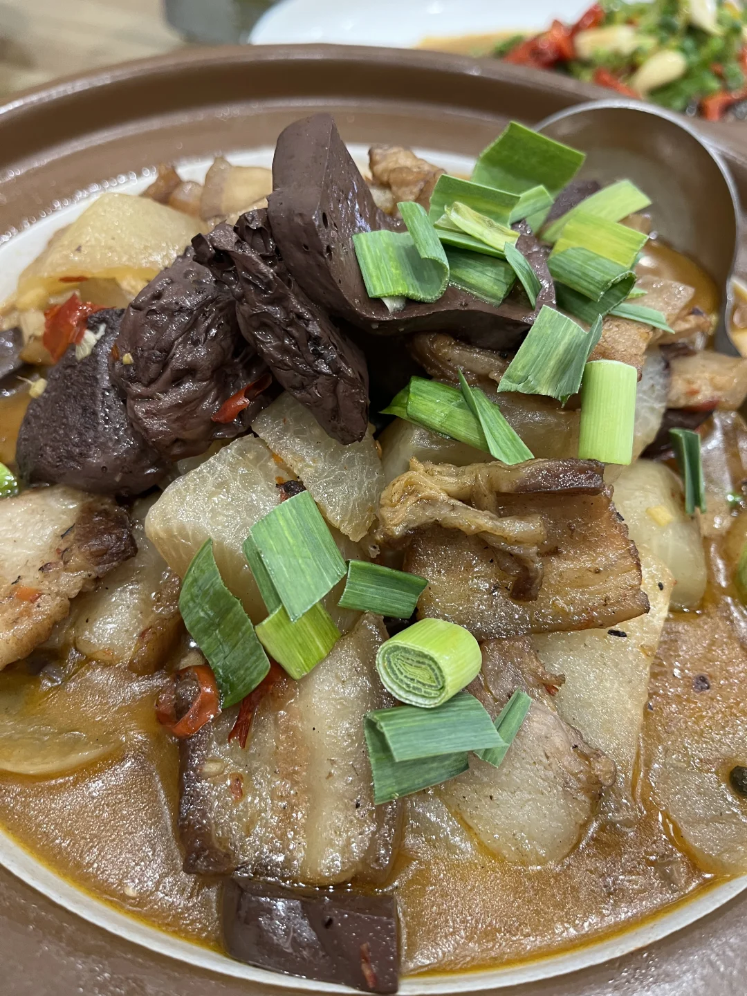 土猪肉炖猪血煲,年轻人可多食,年老人贪恋那种丰腴滑润的口感,但出于健康考虑,浅尝一两筷子,适可而止。好在里面还有煨好的萝卜,吸收了猪肉猪血的香气,入口软烂,分外妖娆。我有时候吃不完打包,回家给一点娃娃菜,二次烹饪,生怕食多了这肥美之物,心中会顿生诸多罪恶感。