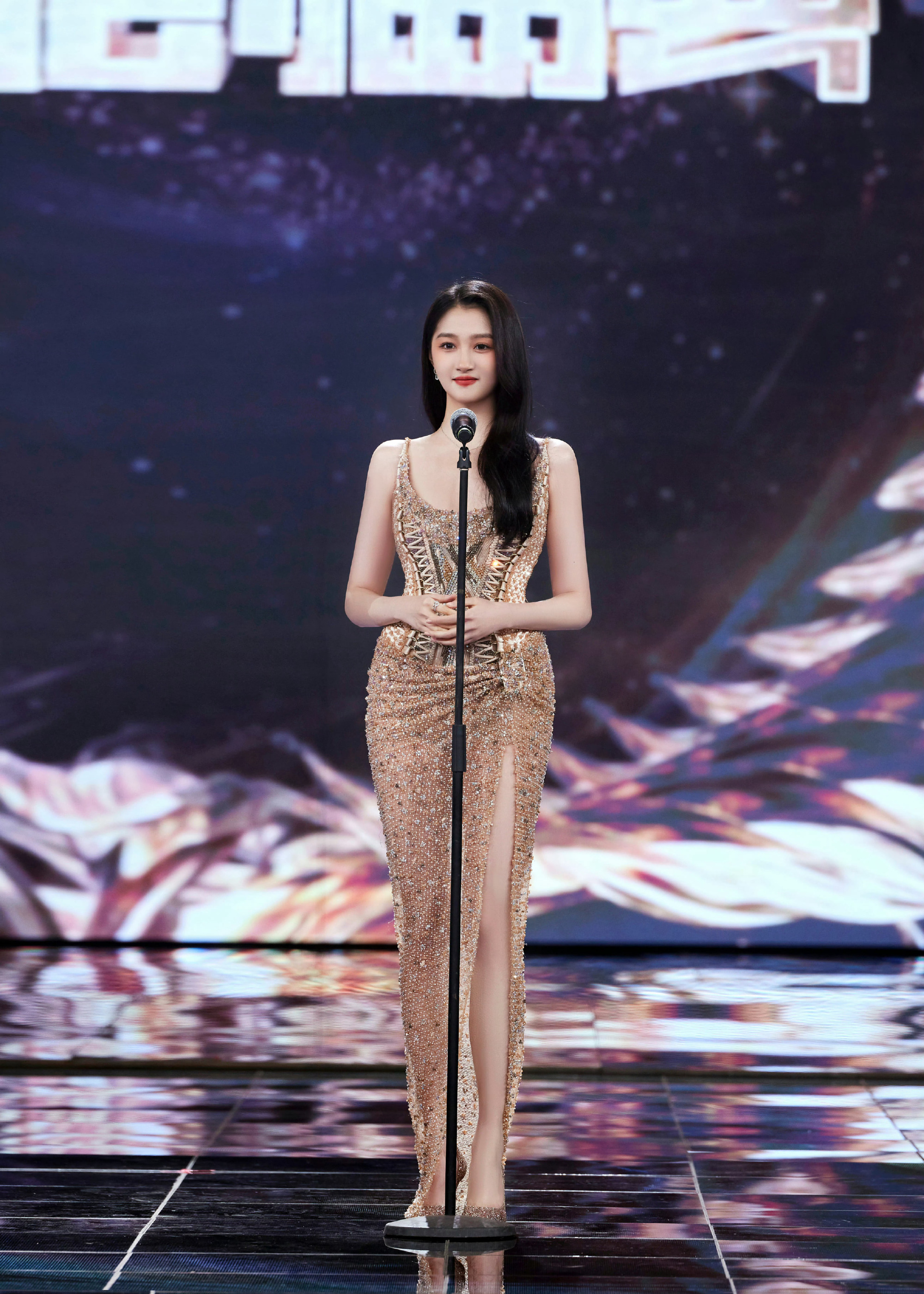 关晓彤,金色透纱长裙,这大长腿真是绝了。关晓彤