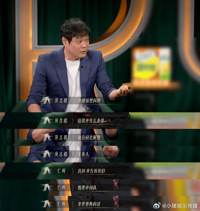 仁科 国足拿世界杯五条人就解散 范志毅追问条件,仁科轻松回应:“中国队拿世界杯,我的乐队就解散。”幽默且聪明,现场气氛瞬间轻松。