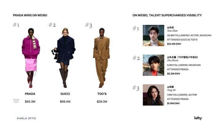 朱志鑫为Prada贡献250万美元EMV据国际权威机构Lefty报道,2026米兰时装周期间,朱志鑫个人EMV为250万美元,这代表其为Prada贡献250万美元EMV,是团内唯一上榜成员,该EMV值位列微博平台所有艺人第二,为Prada品牌登顶微博EMV榜首做出了巨大贡献。朱志鑫米兰时装周EMV微博第二