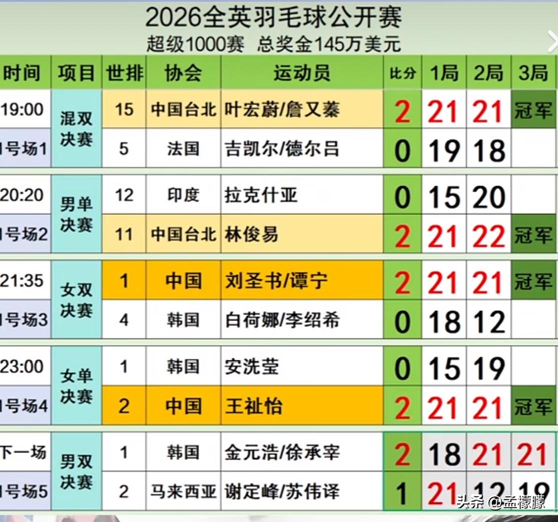 2026全英羽毛球公开赛五个单项的冠亚军出炉,中国队夺得女单、女双冠军 北京时间3月9日讯,“小世锦赛”2026全英羽毛球公开赛决赛日的比赛全部结束,各项冠军全部产生,中国队王祉怡夺得女单冠军,刘圣书/谭宁夺得女双冠军,黑马中国台北夺得男单、混双冠军。 王祉怡半决赛、决赛分别战胜日本山口茜、韩国羽毛球天才安洗莹,含金量十足。 一、男单 冠军:林俊易(中国台北),21-15、22-20 亚军:拉克什亚·森(印度) 二、女单 冠军:王祉怡(中国),21-15、21-19 亚军:安洗莹(韩国) 三、男双 冠军:金元昊/徐承宰(韩国) 18-21、21-12、21-19 亚军:谢定峰/苏伟译(马来西亚) 四、女双 冠军:刘圣书/谭宁(中国) 21-18、21-12 亚军:白荷娜/李绍希(韩国) 五、混双 冠军:叶宏蔚/詹又蓁(中国台北) 21-19、21-18 亚军:吉凯尔/德尔吕(法国) 羽毛球 全英羽毛球公开赛 王祉怡羽毛球赛