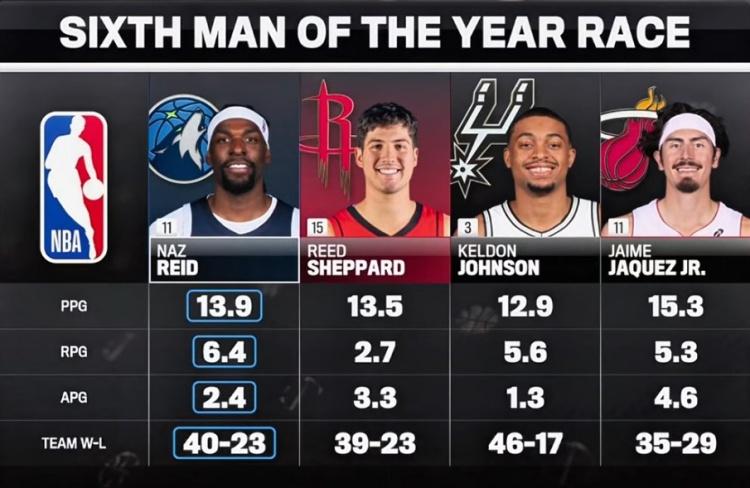 本赛季最佳第六人“4大候选”: 纳兹里德:13.9分6.4篮板2.4助攻 谢泼德:13.5分2.7篮板3.3助攻 凯尔登约翰逊:12.9分5.6篮板1.3助攻 小海梅哈克斯:15.3分5.3篮板4.6助攻 从数据上看,几个人相差不大。 但具体到每个球队里,谢泼德和凯尔登约翰逊的作用就比较明显了。 谢泼德给火箭提供了外线的火力输出,并且有一定的持球能力,填补了本赛季火箭缺少控卫的缺陷,虽然还不是足够成熟的后卫,但在动辄就被包夹的杜兰特身边,谢泼德显得格外重要。 凯尔登约翰逊也相当出色。马刺现在后卫储备充足,内线有文班亚马一柱擎天,只有锋线稍微显得弱小了一些,而凯尔登约翰逊提供了足够的轻度和对抗。 马刺在很多次进攻断电的时刻,都是凯尔登约翰逊强杀内线去稳住局面。 马刺最耀眼的人当然是文班亚马,卡斯尔和福克斯等人也相当具有热度和话题性,而凯尔登约翰逊做的一点儿不比他们少,甚至在防守端作用更大。 因为对手的锋线,不想进内线面对文班亚马,最后都去找凯尔登约翰逊了...