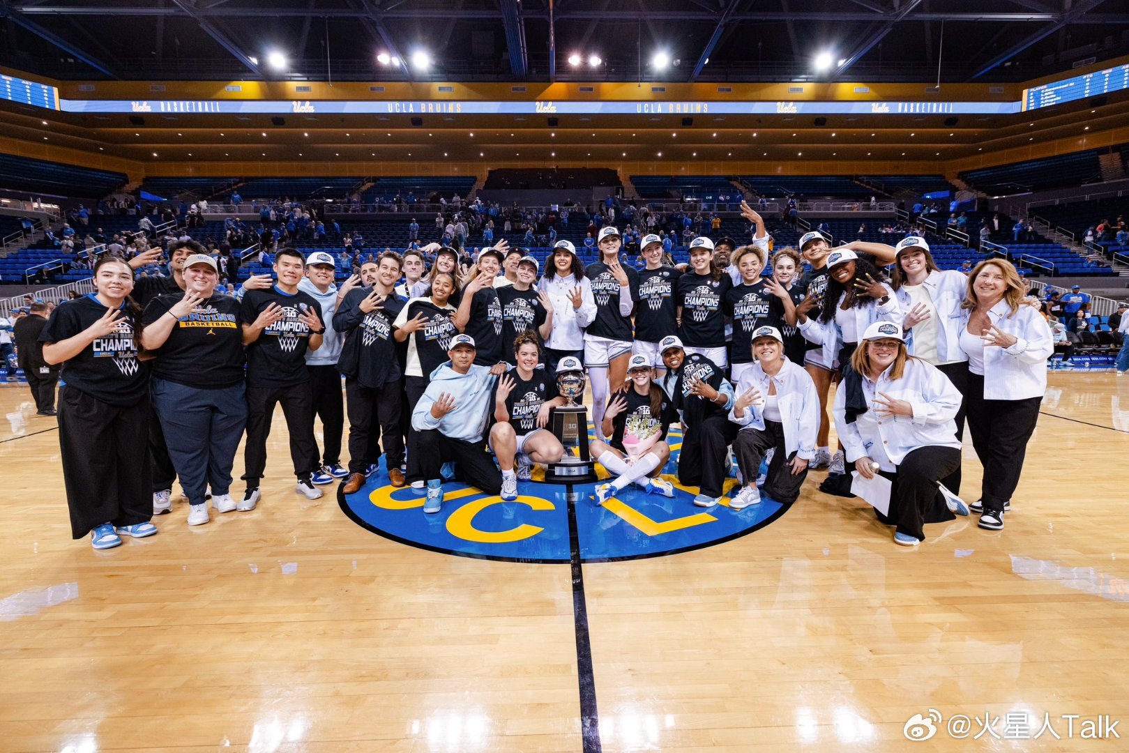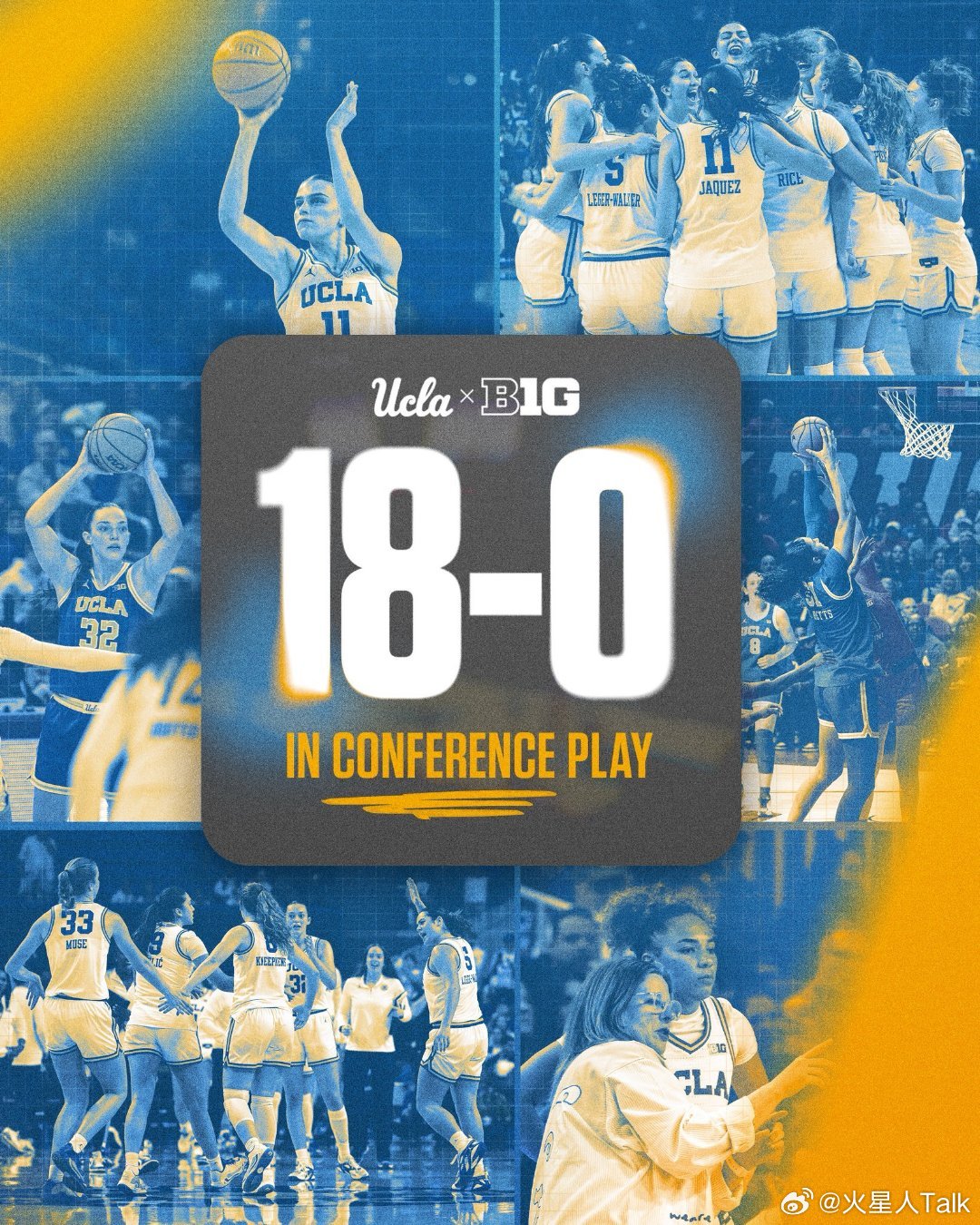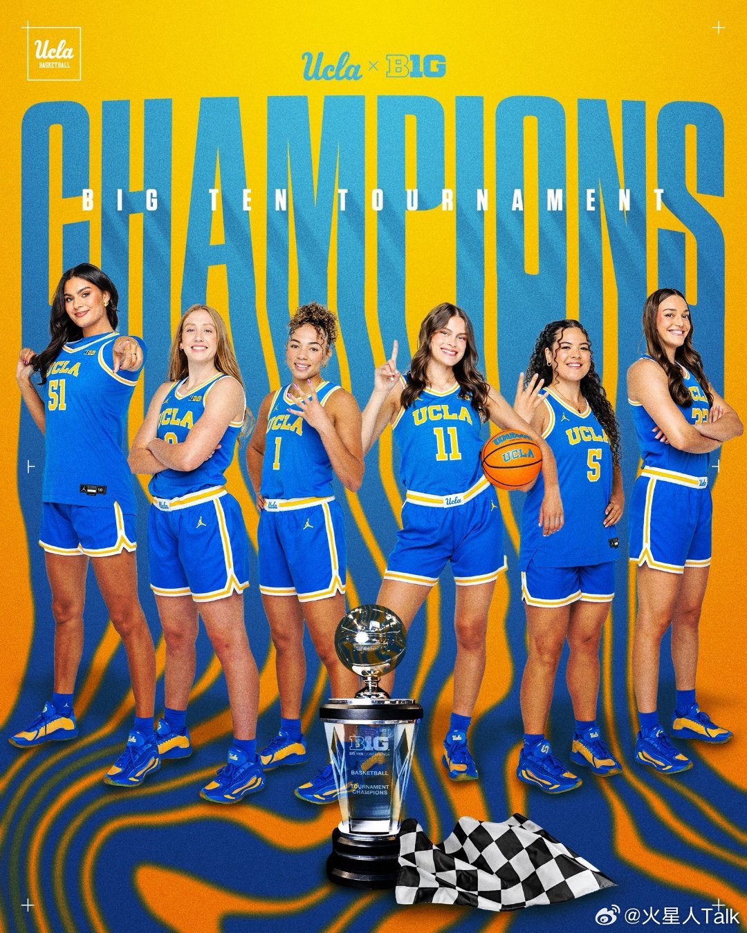 NCAA女篮 2025-2026赛季Big Ten联盟锦标赛决赛加州大学洛杉矶分校51分大胜爱荷华大学,首次单赛季同时夺得常规赛和锦标赛冠军,六人得分上双,40个进球34个助攻,首节22比5。棕熊Kiki Rice荣获MOP,13中7得到15分8助攻3抢断。Gianna Kneepkens11中6得到19分。Lauren Betts9中5,10分3抢断。替补Sienna Betts8中7,14分7篮板5助攻。鹰眼投篮命中率不足30%,失误高达19次。Ava Heiden11中7得到15分。Chazadi Wright16中4得到9分。Stuelke和Feuerbach9中0。替补Addie Deal8中3得到11分。