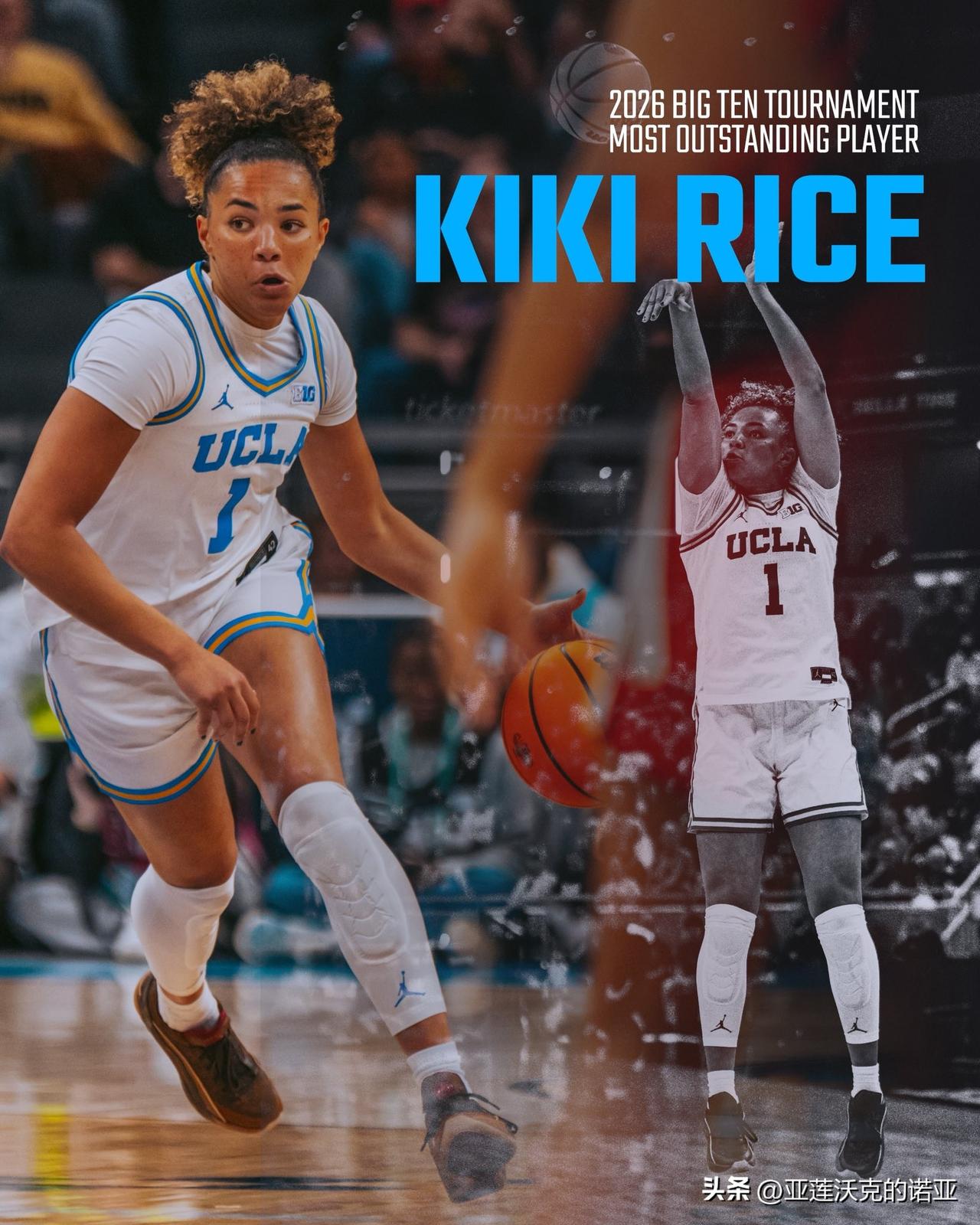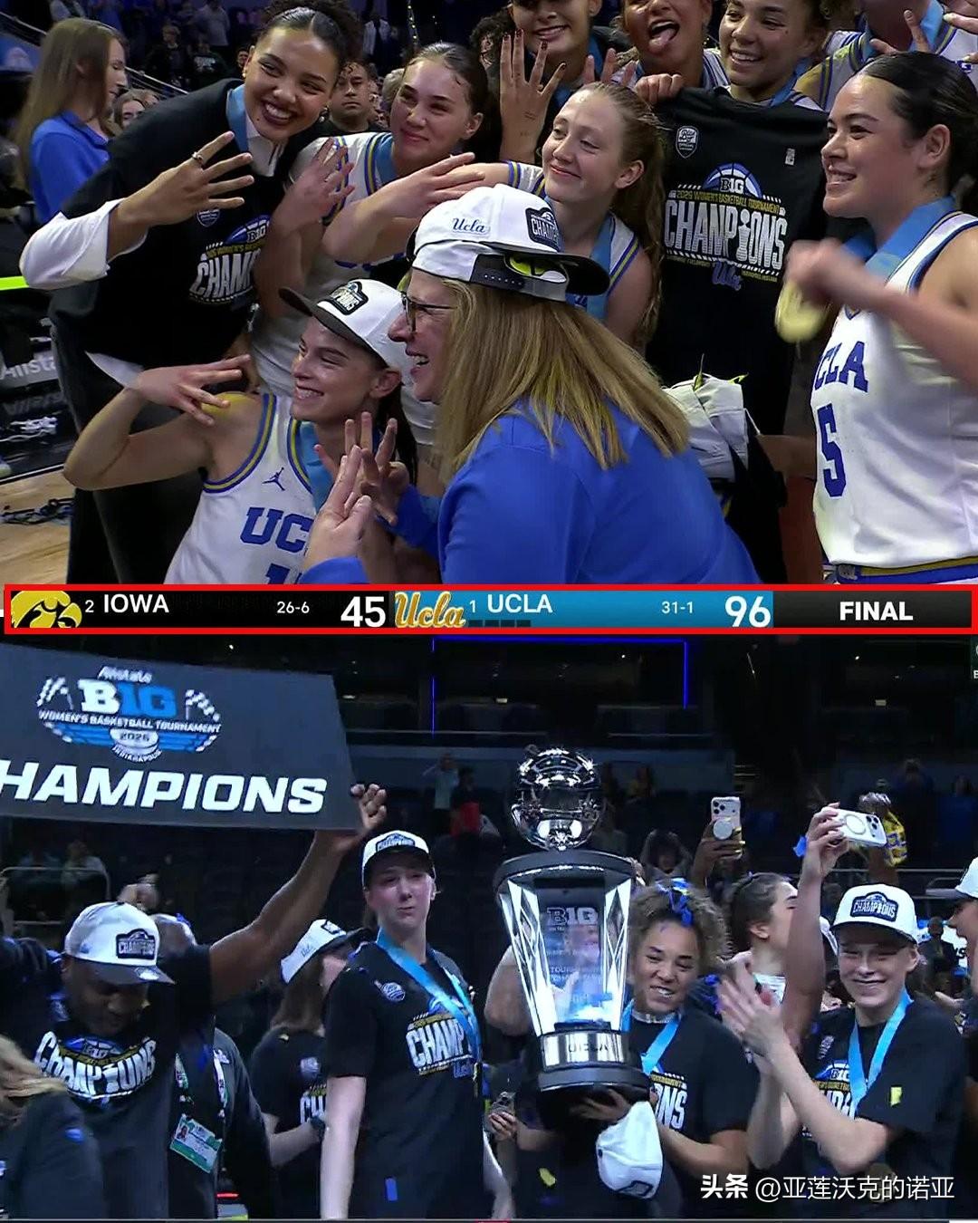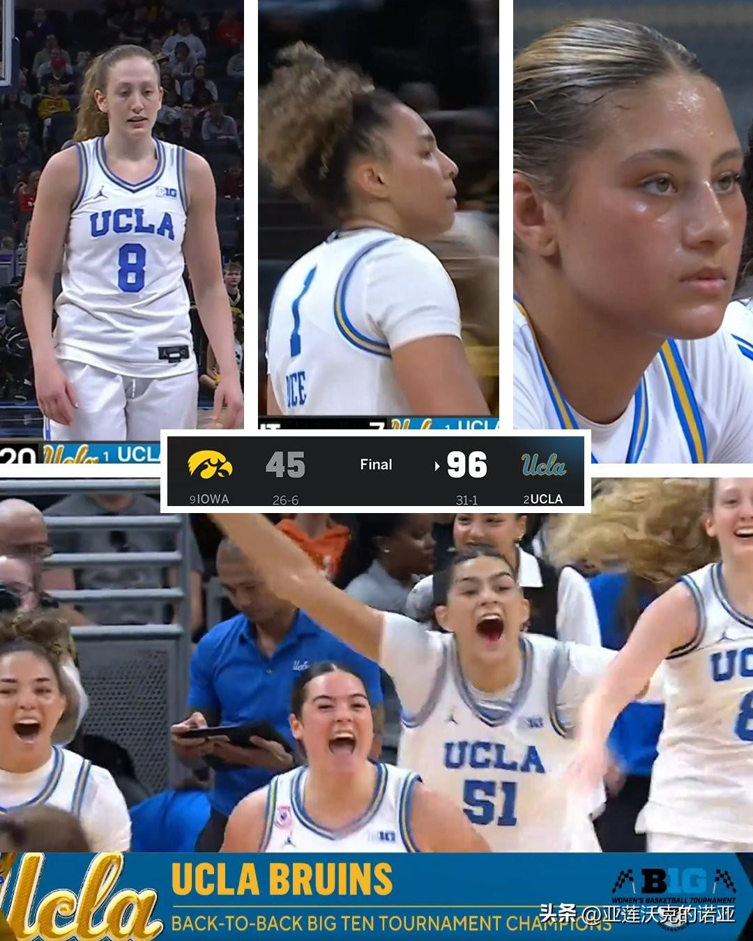 UCLA以51分大胜爱荷华大学,对阵美联社前十球队的最大分差,也是Big Ten联盟冠军赛历史上最大的一场胜利,新人内线Sienna Betts替补14分7篮板5助攻表现出色,大四后卫Kiki Rice荣获锦标赛MOP,棕熊连续两年夺冠,莱斯赛后说我们有很多球员,这是我们最后一年比赛,这意义重大。
