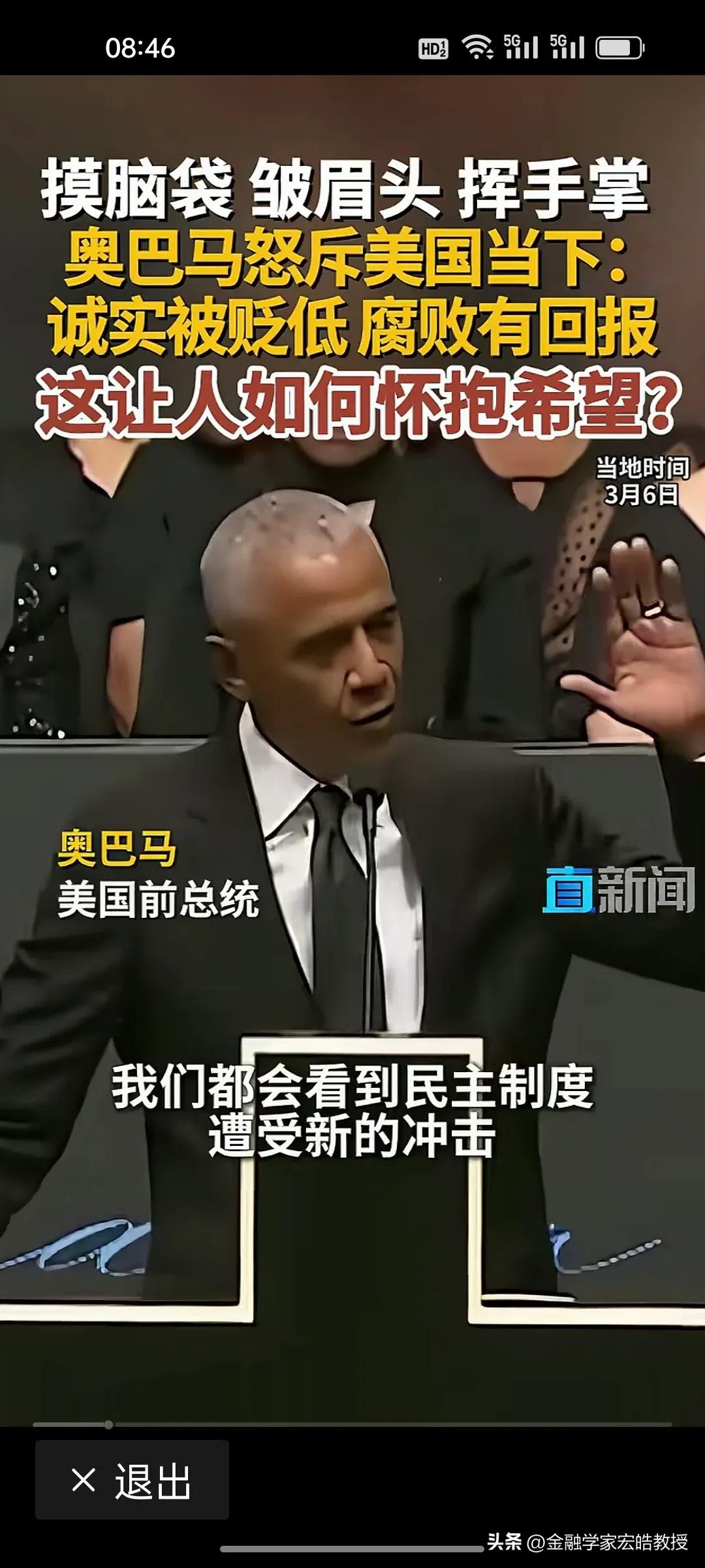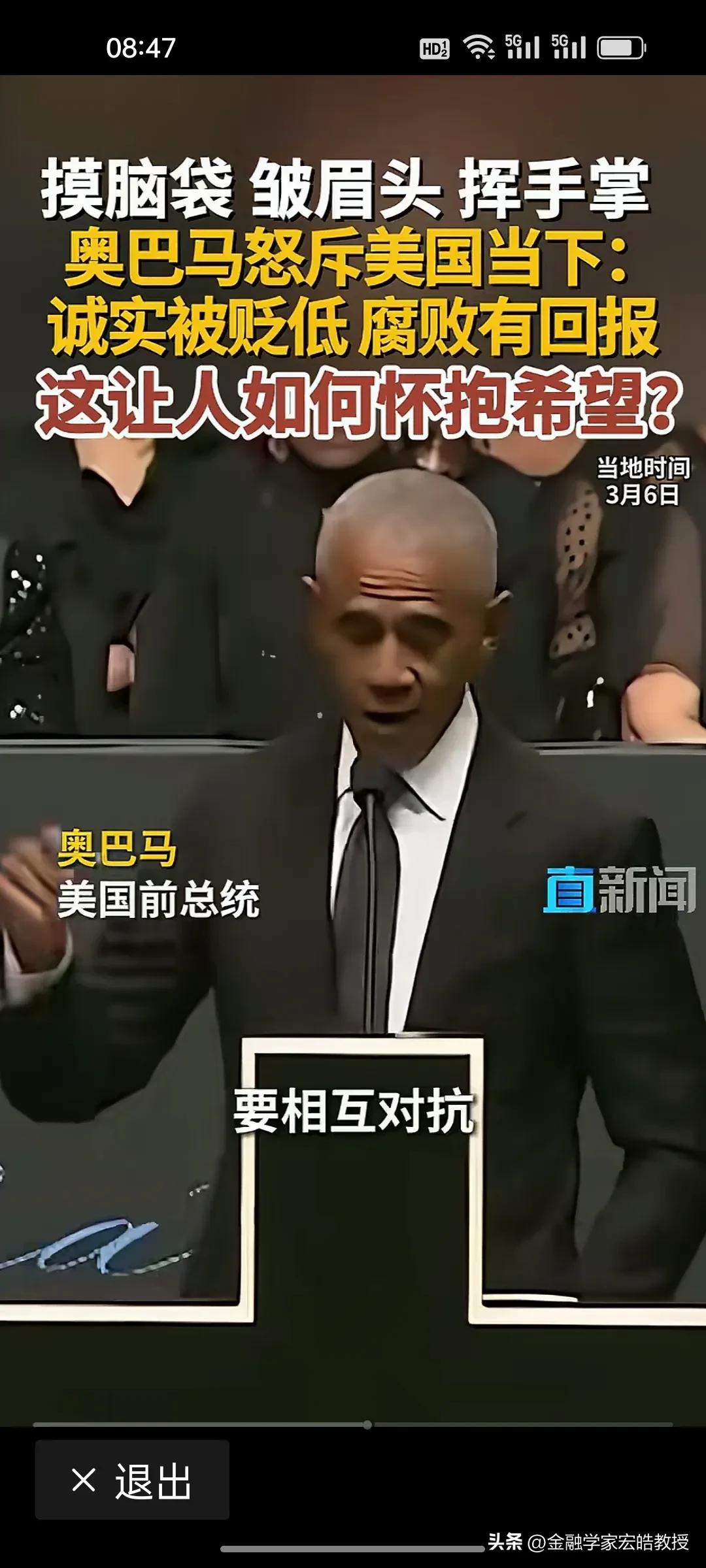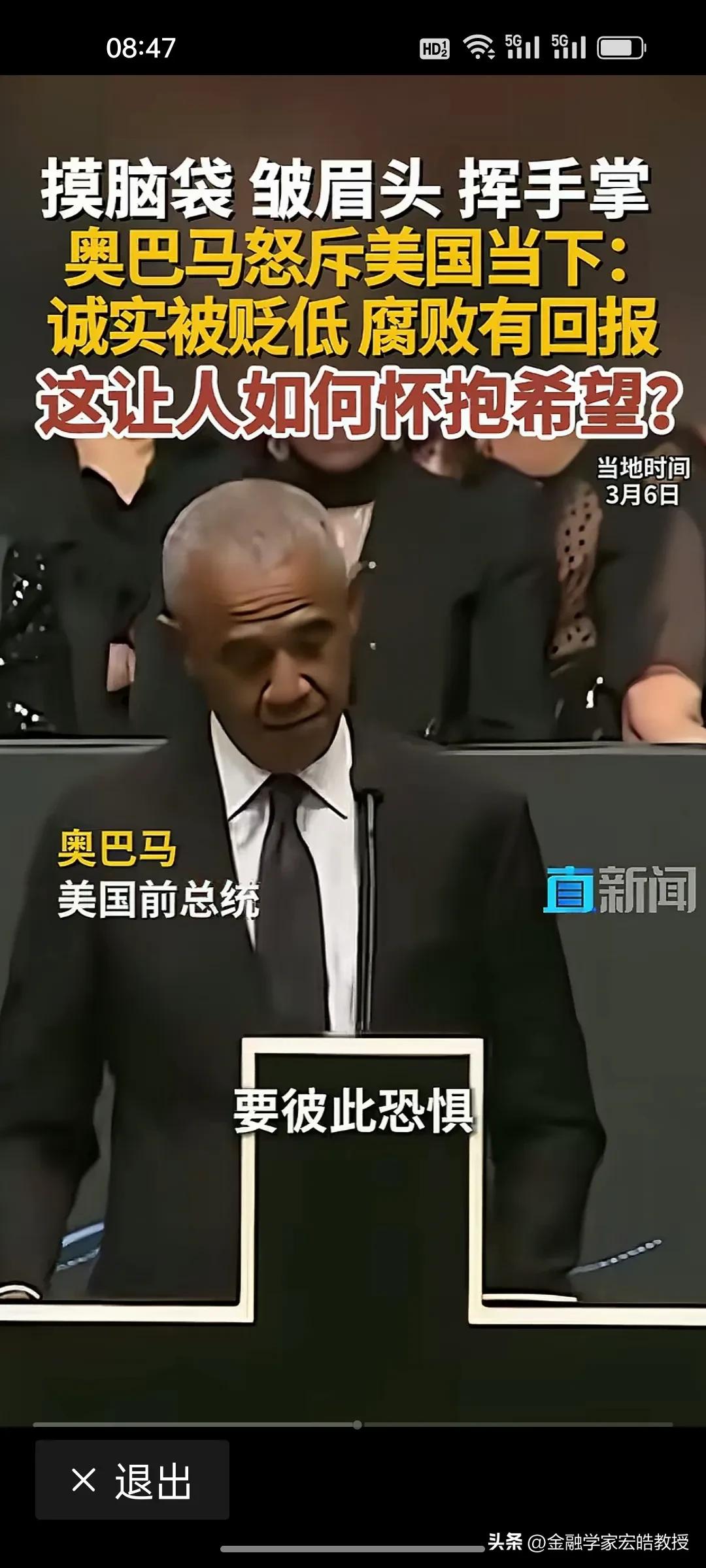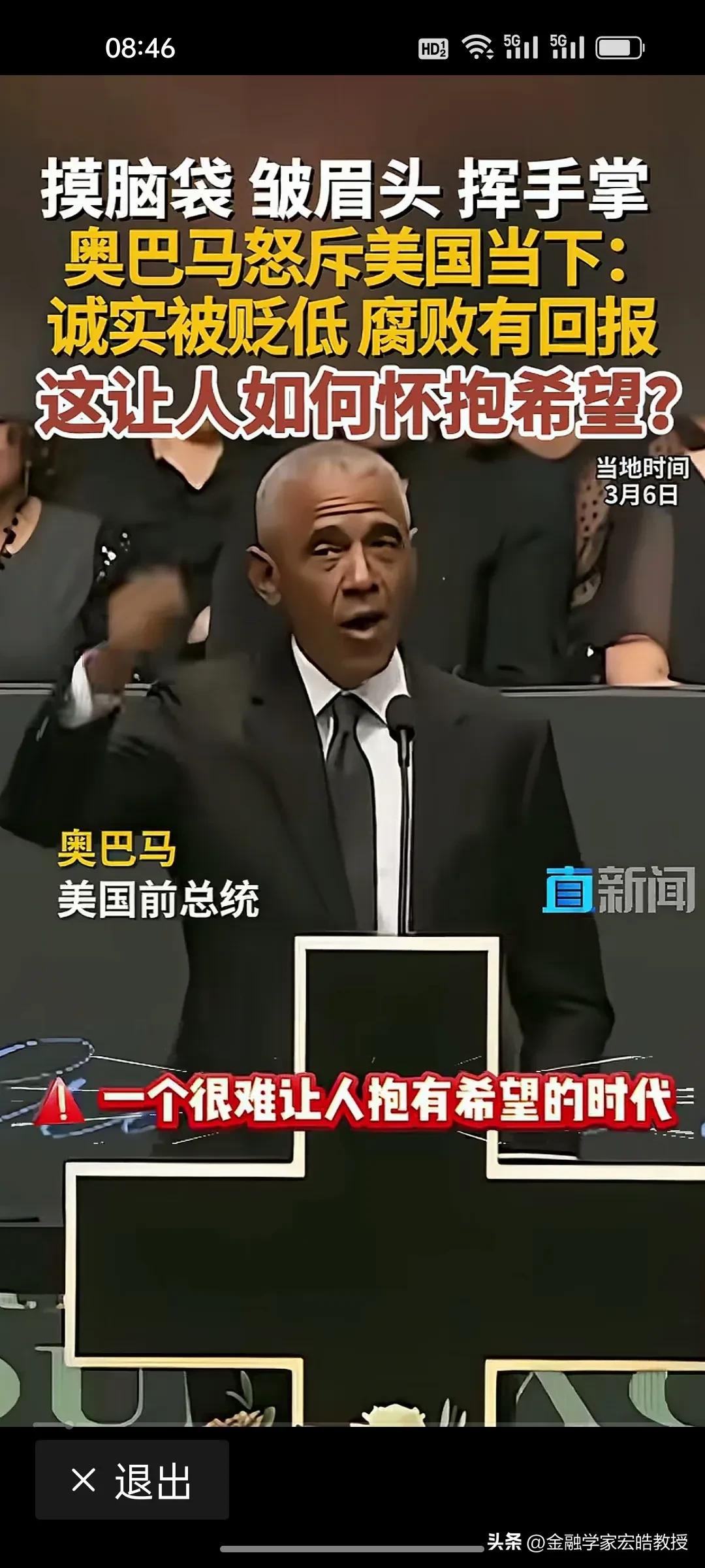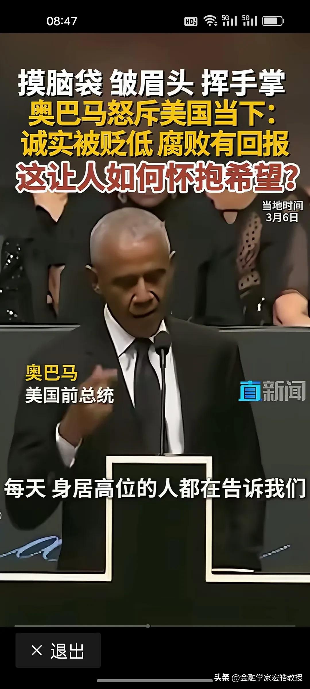 美国前总统奥巴马在昨天演讲中情绪激动,摸着脑袋怒斥当下美国“诚实被贬低,腐败有回报”,直言这是一个“很难让人怀抱希望”的时代。台下掌声雷动,都对奥巴马的这番话表示赞同。 奥巴马在位时于2011年推行“重返亚太”,卸任后却直指美国衰退的根源:民主制度受冲击、法治观念倒退、贪婪偏执被颂扬。这种“在位糊涂,下台清醒”的反差,恰恰戳破了美式民主的虚伪面纱。 特朗普要听到奥巴马的这番话,脸都该气绿了。因为在特朗普说过,对他唯一的约束就是他自己的道德观念。他主导的美国就是一个再次强大的美国。干任何事情都是“大胜特胜”,尽管他已经凭一己之力把美国拖向深渊,可是他依旧穿着“皇帝的新装”,言不惭地说自己“赢麻了”。