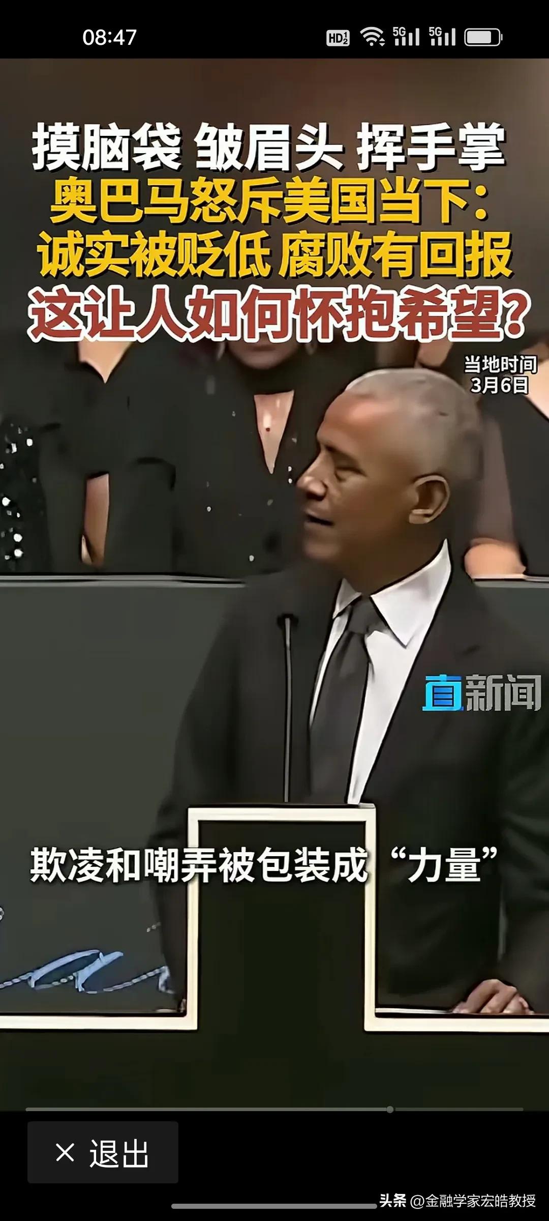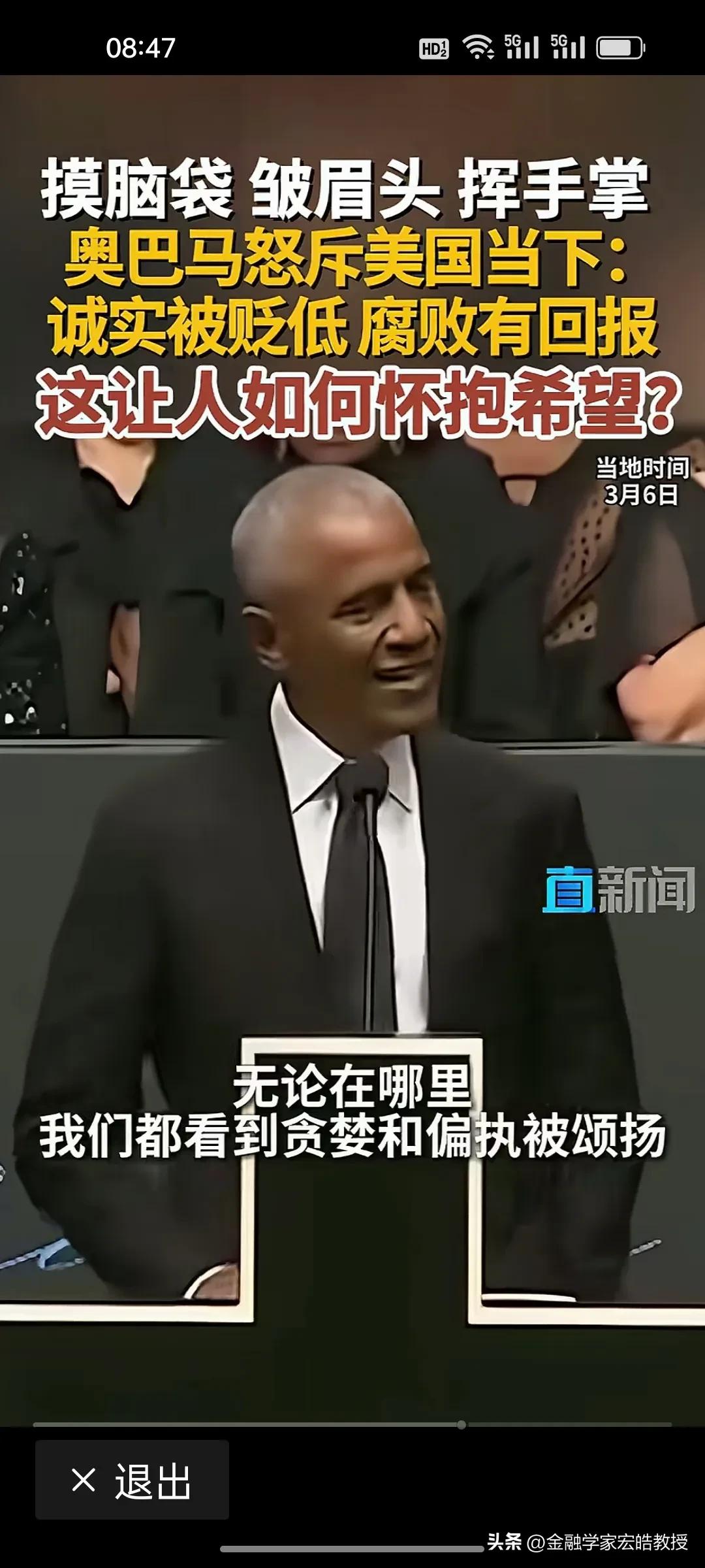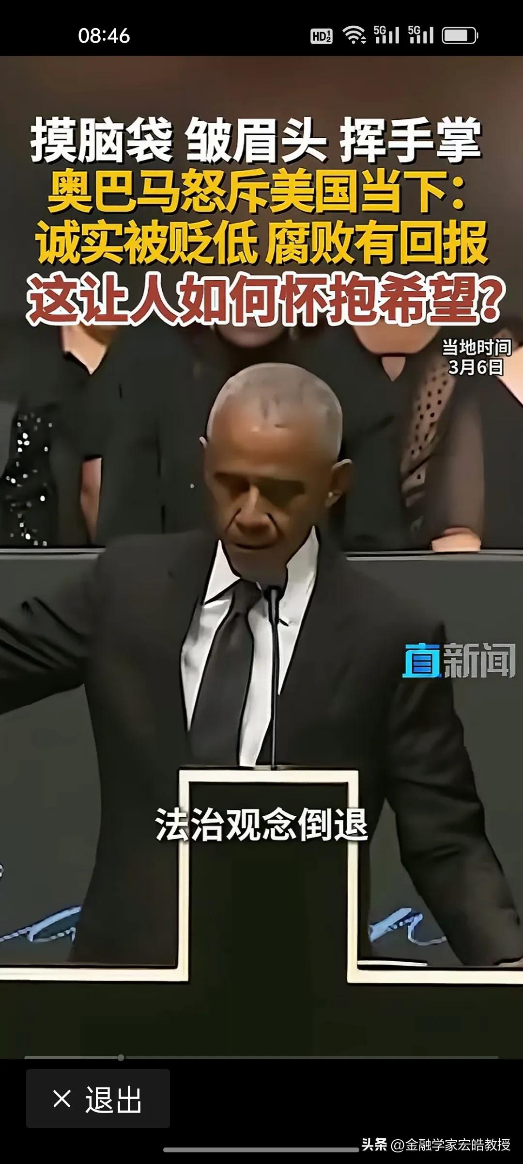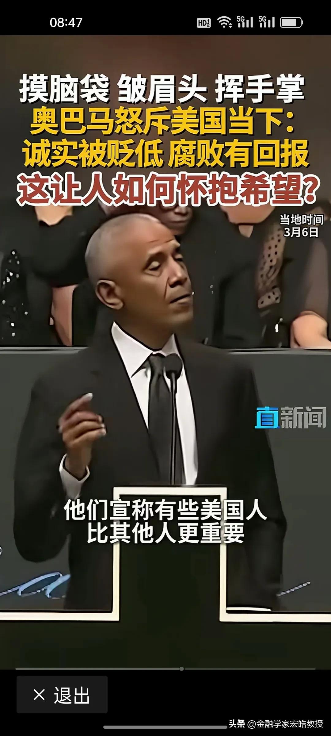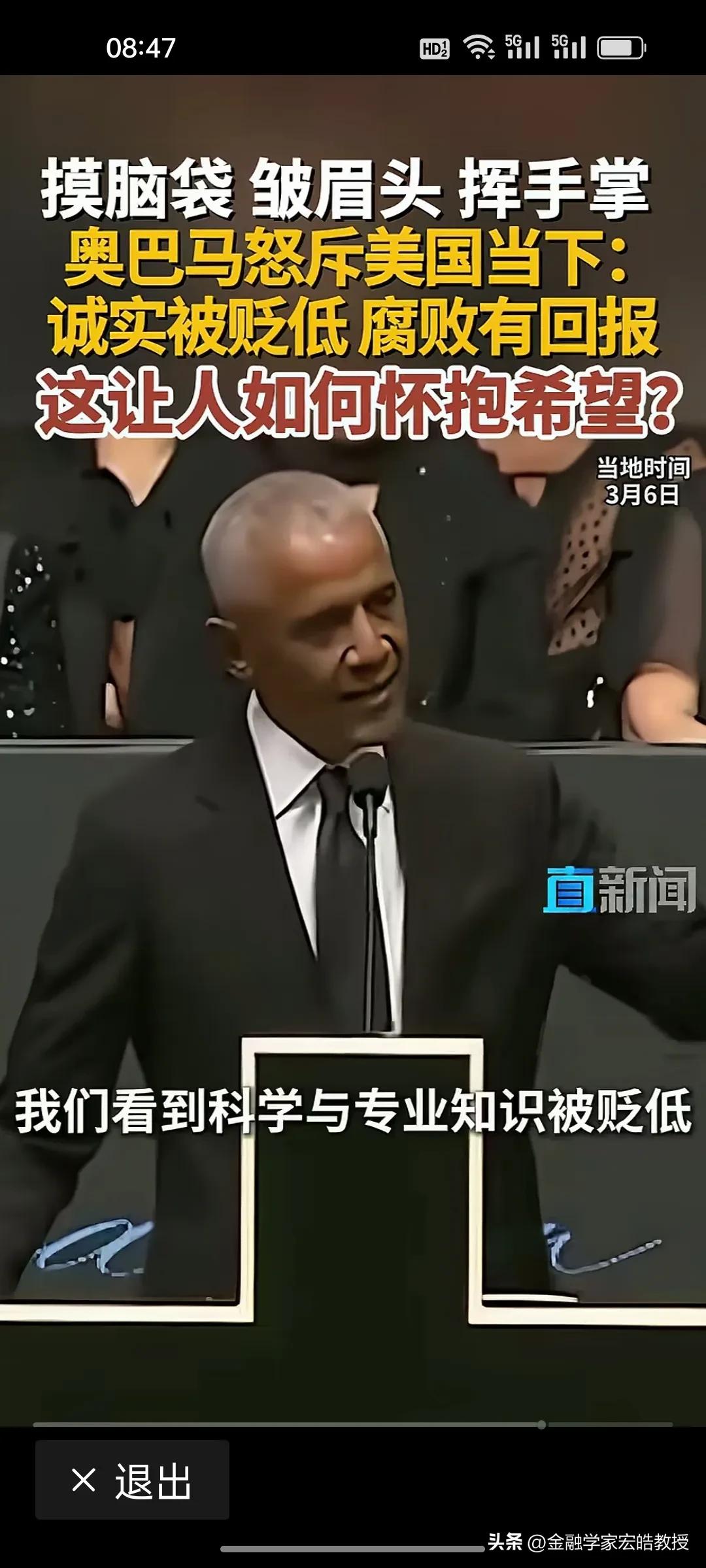 美国前总统奥巴马在昨天演讲中情绪激动,摸着脑袋怒斥当下美国“诚实被贬低,腐败有回报”,直言这是一个“很难让人怀抱希望”的时代。台下掌声雷动,都对奥巴马的这番话表示赞同。 奥巴马在位时于2011年推行“重返亚太”,卸任后却直指美国衰退的根源:民主制度受冲击、法治观念倒退、贪婪偏执被颂扬。这种“在位糊涂,下台清醒”的反差,恰恰戳破了美式民主的虚伪面纱。 特朗普要听到奥巴马的这番话,脸都该气绿了。因为在特朗普说过,对他唯一的约束就是他自己的道德观念。他主导的美国就是一个再次强大的美国。干任何事情都是“大胜特胜”,尽管他已经凭一己之力把美国拖向深渊,可是他依旧穿着“皇帝的新装”,言不惭地说自己“赢麻了”。