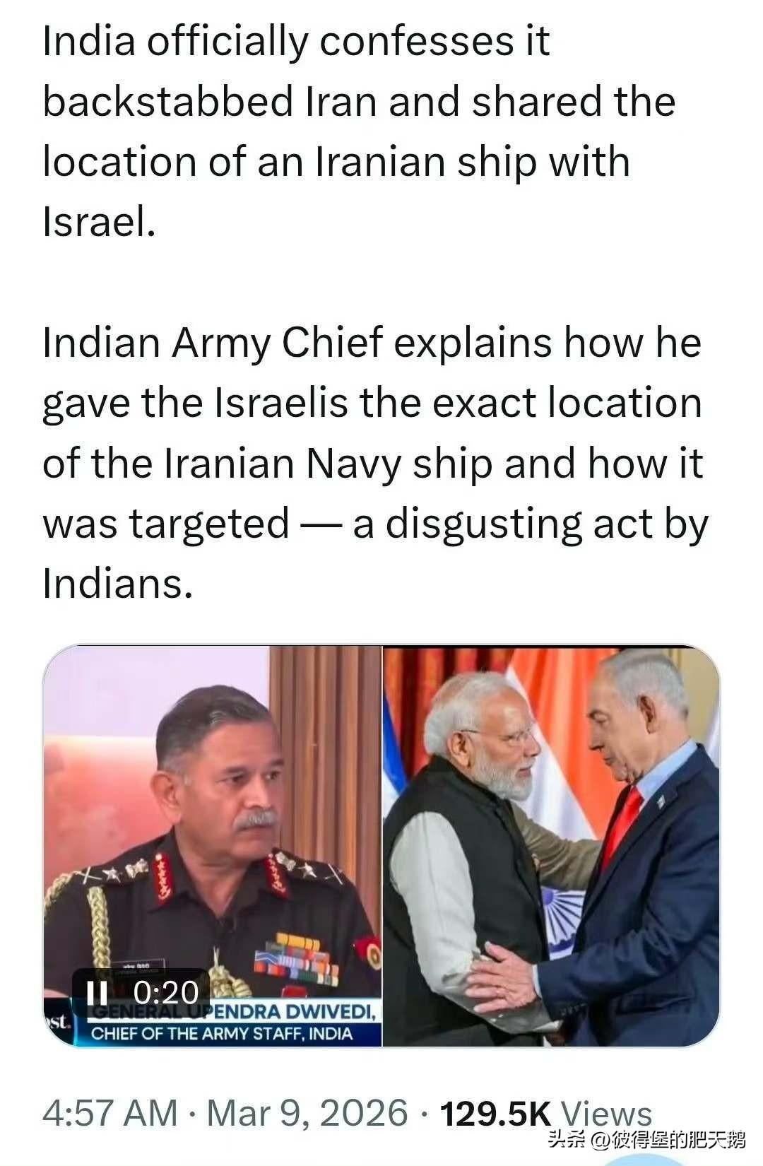 这确实是印度能干得出来的事儿,阴险小人行径! 印度三哥正式承认背叛了伊朗 印度陆军参谋长解释了他是如何向以色列人提供了伊朗海军舰艇的确切位置以及该舰艇为何被盯上。 印度的行为令人作呕。 美伊以冲突