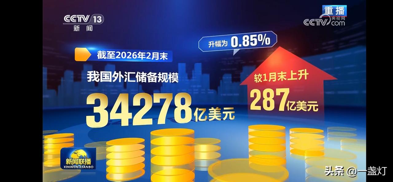 截止2月末,我国外汇储备34278亿美元,较上月增287亿美元,升幅为0.85%
