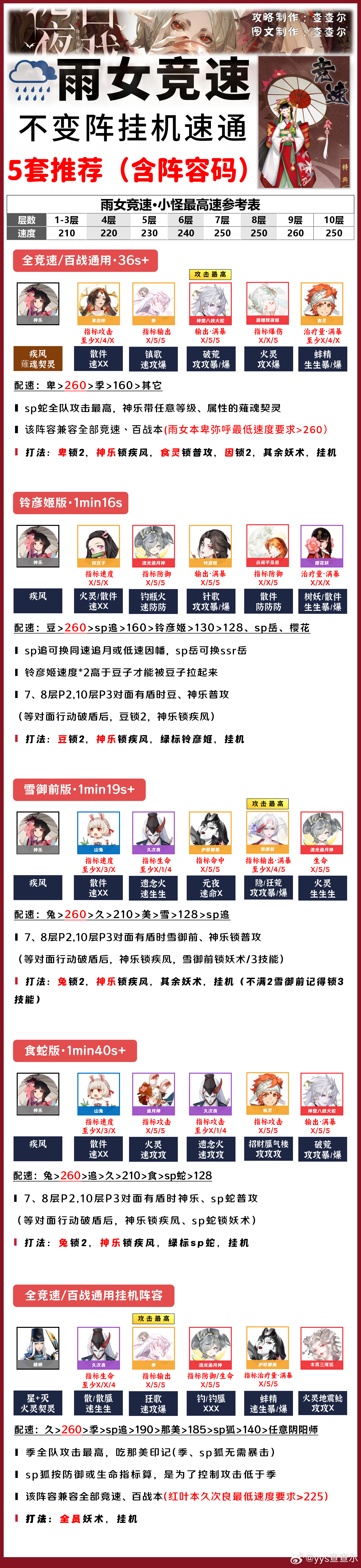 阴阳师手游超话创作官acg优创官 【雨女竞速】1-10层不变阵挂机,5套+阵容码■含两套全秘闻竞速/百战通用阵容文字码:①竞速、百战通用·蛇卑36s+|TA|82afe0206159319ad3441a2196dec17c
