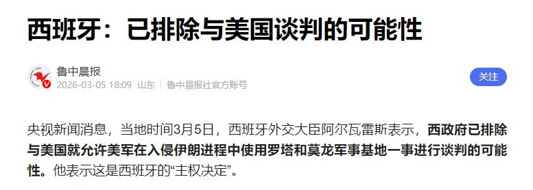硬刚美国!西班牙外长表态 3月5日,西班牙外交大臣阿尔瓦雷斯明确宣布:政府已排除与美国进行任何谈判的可能性,坚决不允许美军在针对伊朗的军事行动中使用西班牙的罗塔和莫龙军事基地,他强调这是西班牙的“主权决定”,西班牙站在国际法一边。 可能很多人会疑惑,西班牙作为北约成员国,向来和美国是“盟友”,怎么敢如此直接地硬刚美国?其实这不是西班牙第一次对美国说“不”,背后藏着太多现实考量和历史教训,而且这次的表态,每一句都有理有据,绝非一时冲动。 首先得搞清楚,罗塔和莫龙这两个军事基地对美国有多重要,罗塔海军基地在西班牙南部加的斯省,扼守直布罗陀海峡这个大西洋进入地中海的“玄关”,1953年就和美国签订协议共同使用,是美军在地中海唯一能支援两栖作战的基地,常年部署着6艘“宙斯盾”战舰,负责给美军第六舰队补给燃料、弹药,相当于美国在地中海的“后勤中枢”。 而莫龙军事基地在塞维利亚省,1988年建成,主要帮美军保障飞机部署和运输,能直接支援美军在非洲、欧洲和中东的行动,对美国针对伊朗的军事部署来说,这两个基地就是“关键节点”。 按照美西1988年的军事合作协议,美军要使用这两个基地运送武器或有争议物品,必须经过西班牙政府授权,这本身就是西班牙的主权体现。 阿尔瓦雷斯的表态,其实就是在重申这份协议,更是在守住自己的主权底线——毕竟基地在西班牙境内,怎么用、给谁用,理应由西班牙自己说了算,而不是被美国牵着鼻子走,更不能成为美国发动单边军事行动的“工具”。 而西班牙敢硬刚美国,最核心的原因是2003年伊拉克战争留下的惨痛教训,当年西班牙政府盲目跟随美国,允许美军使用这两个基地参与伊拉克战争,结果不仅遭到国内80%以上民众的反对,还引发了2004年马德里通勤列车爆炸案,193人遇难、两千多人受伤,这是西班牙历史上最严重的恐怖袭击,直接导致当时的政府下台。 这段刻骨铭心的经历,让西班牙人深刻明白,盲从美国的单边军事行动,只会给自己带来灾难,所以这一次,无论美国如何施压,西班牙都不愿重蹈覆辙。 而且,现在的西班牙民众的反战情绪和对美国的不信任感越来越强,最新民调显示,欧洲民众对美国的友好度大幅下滑,西班牙民众对美国的认可度更是低于欧盟平均水平,大家都不想再被美国绑上战争的战车,阿尔瓦雷斯的表态,其实也是顺应了国内主流民意,毕竟一个国家的外交政策,终究要站在本国人民的利益之上。 可能有人会问,西班牙这么做,就不怕美国报复吗?其实西班牙早就有了准备,而且它的表态也得到了欧盟内部的支持,欧盟委员会主席冯德莱恩、法国总统马克龙都曾致电支持西班牙,毕竟越来越多的欧洲国家开始觉醒,不想再一味依附美国,而是想追求战略自主。 事实上,西班牙的拒绝已经产生了实际影响,此前就有15架美军加油机因为无法使用这两个基地,不得不转场到更远的德国基地,美军针对伊朗的军事行动也因此受到限制。 阿尔瓦雷斯强调“站在国际法一边”,绝非空话,美国针对伊朗的军事行动,本身就绕开了联合国安理会,没有合法的国际法依据,属于单边主义行为。而西班牙坚守这一原则,不仅是在维护国际法的权威,也是在向世界传递一个信号:哪怕是美国的盟友,也不会无底线妥协,主权和和平永远比所谓的“盟友关系”更重要。 说到底,西班牙的硬刚,不是要和美国彻底决裂,而是想拿回属于自己的主权,拒绝成为美国单边行动的“帮凶”,这背后是欧洲战略自主意识的觉醒,也是越来越多国家对单边主义的反抗。 毕竟,在和平与战争面前,每个国家都有选择的权利,而西班牙这次用行动告诉世界,哪怕面对超级大国的压力,也能守住自己的底线,站在正义和国际法的一边。