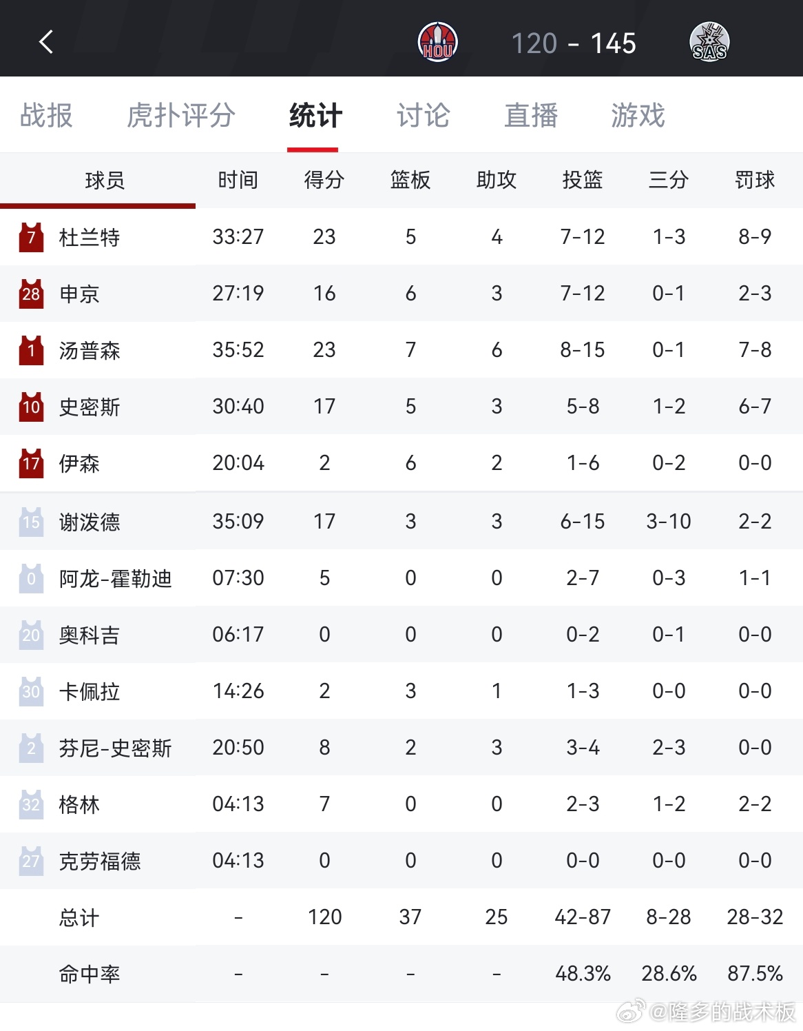 火箭120-145不敌马刺,火箭和湖人差距仅有0.5胜场火箭vs马刺
