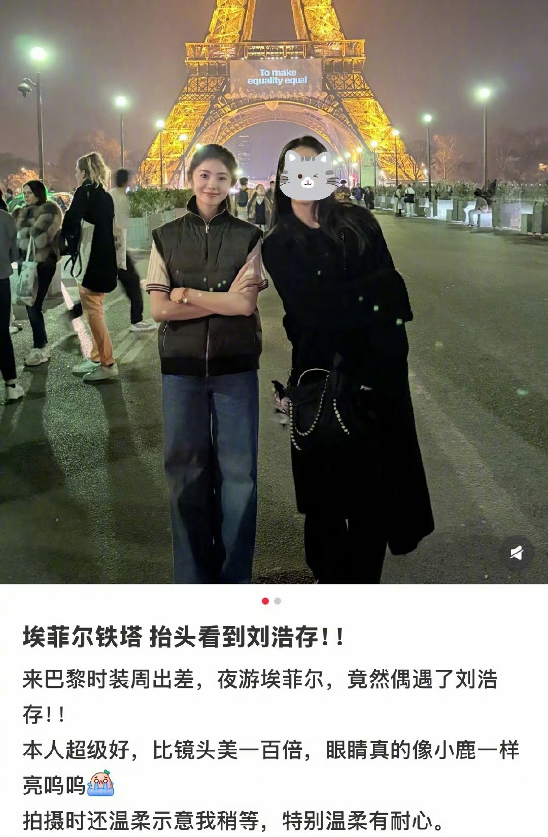网友巴黎铁塔偶遇刘浩存 跟路人在巴黎铁塔下合影夜游巴黎铁塔偶遇刘浩存也太幸运了吧!温柔又亲切,还和路人暖心合影,谁不羡慕这梦幻同框呀~