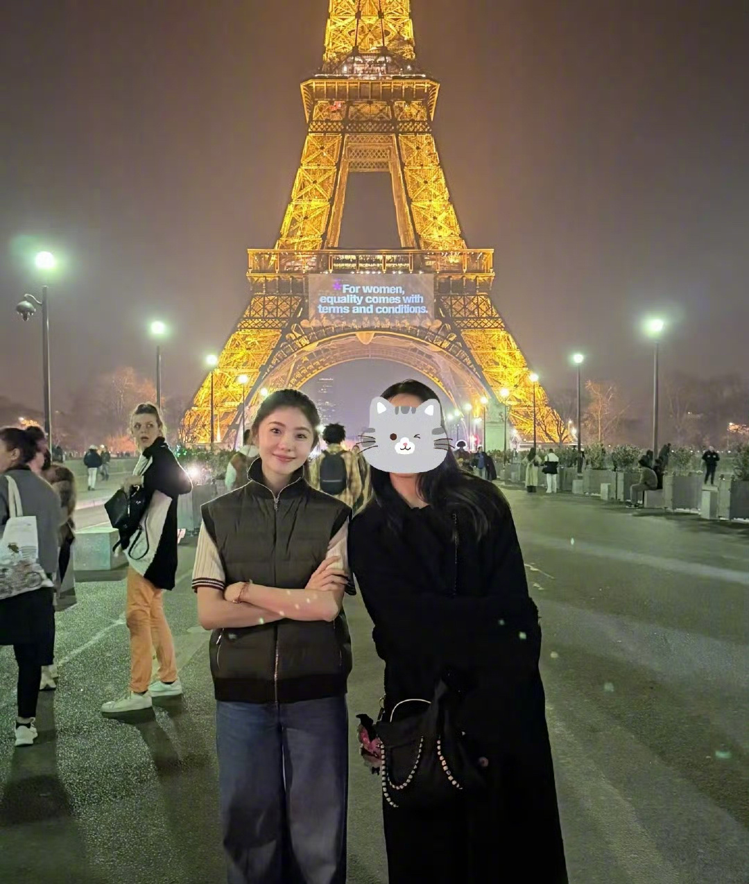 网友巴黎铁塔偶遇刘浩存 跟路人在巴黎铁塔下合影夜游巴黎铁塔偶遇刘浩存也太幸运了吧